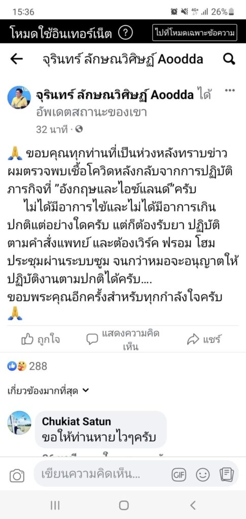 “ขอบคุณทุกท่านที่เป็นห่วงหลังทราบข่าว ผมตรวจพบเชื้อโควิดหลังกลับจากการปฏิบัติภารกิจที่ ”อังกฤษและไอซ์แลนด์”ครับ ไม่ได้มีอาการไข้และไม่ได้มีอาการเกินปกติแต่อย่างใดครับ แต่ก็ต้องรับยา ปฏิบัติตามคำสั่งแพทย์ และต้องเวิร์ค ฟรอม โฮม ประชุมผ่านระบบซูม จนกว่าหมอจะอนุญาตให้ปฏิบัติงานตามปกติได้ครับ….ขอบพระคุณอีกครั้งสำหรับทุกกำลังใจครับ ”