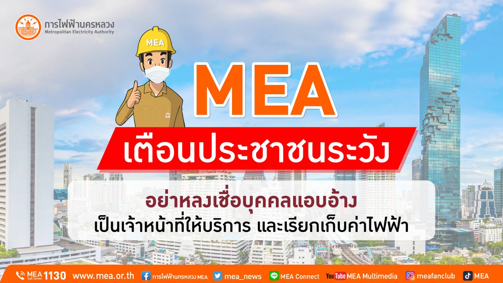 MEA มีความห่วงใยประชาชน จึงขอเตือนอย่าหลงเชื่อตกเป็นเหยื่อ MEA ยืนยันว่าปัจจุบันไม่มีตัวแทนพนักงานรับชำระค่าไฟฟ้า เก็บเงินค่าเปลี่ยนเครื่องวัดฯ รวมถึงไปดำเนินการตรวจซ่อมอุปกรณ์ไฟฟ้าเก็บค่าบริการนอกสถานที่แต่อย่างใด ยกเว้นกรณีที่ MEA มีงานบริการสำหรับผู้ใช้ไฟฟ้า จัดกิจกรรมส่งเสริมความสัมพันธ์กับชุมชน หรือโครงการต่าง ๆ ซึ่ง MEA จะมีการประชาสัมพันธ์ให้ผู้ใช้ไฟฟ้าทราบผ่านช่องทางสื่อสารทางการของ MEA หรือสื่อมวลชนก่อนทุกครั้ง