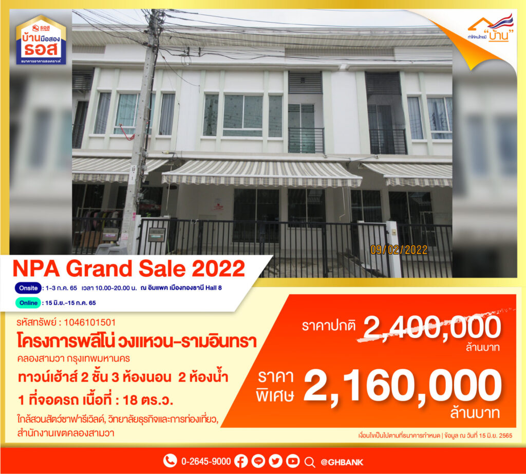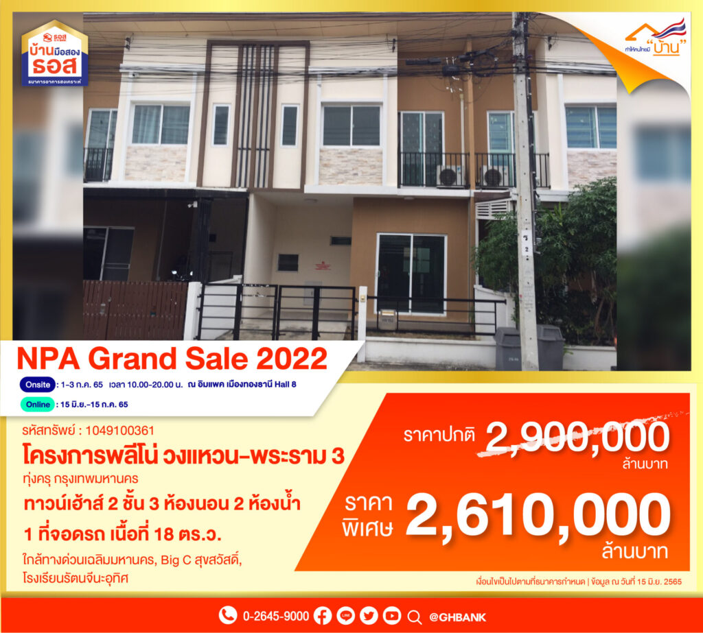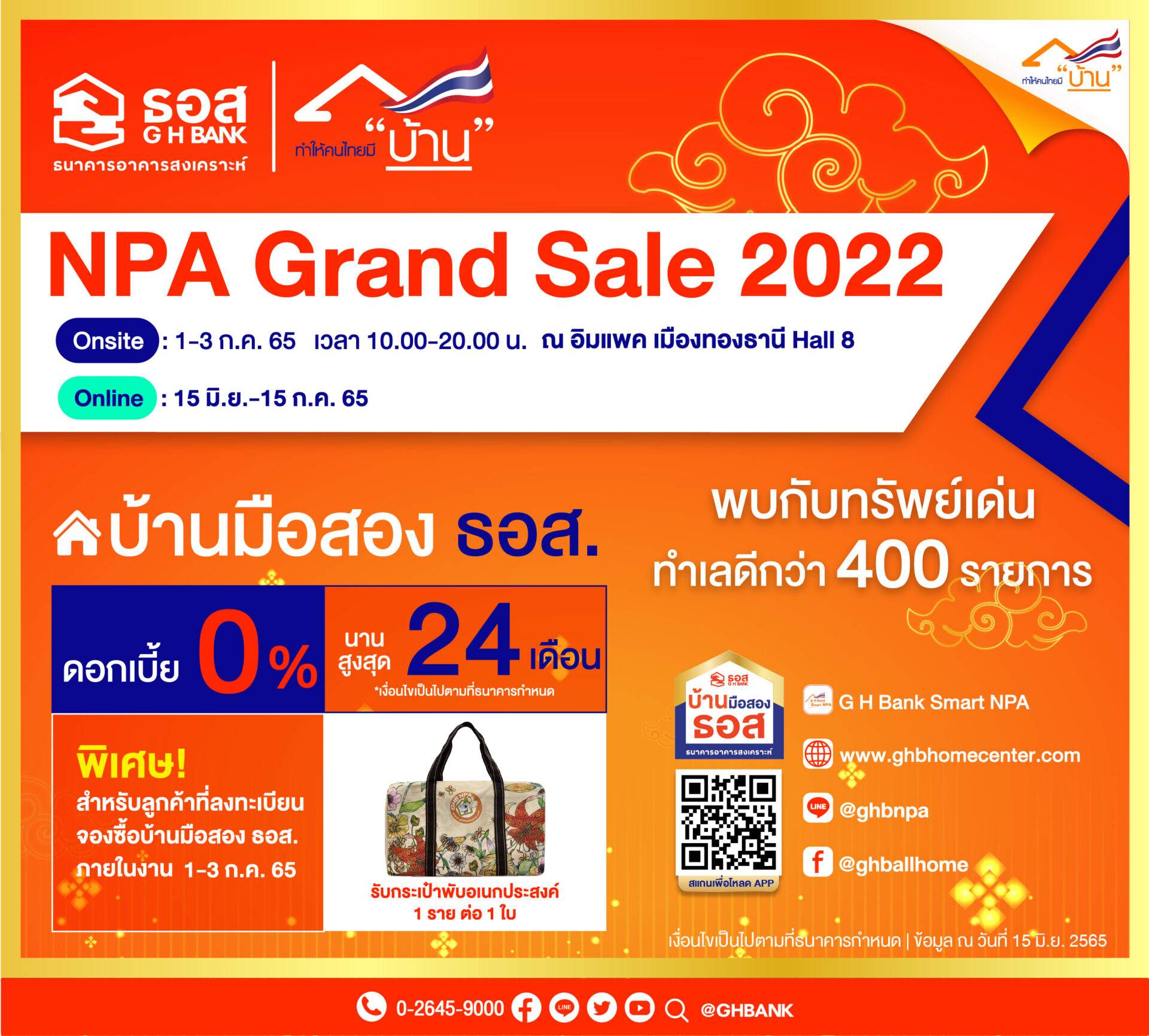 กรุงเทพฯ 30 มิ.ย. – ธอส. มหกรรมสินเชื่อบ้านและบ้านมือสองซึ่งจะพบกับบ้านมือสองของ ธอส. กว่า 400 รายการ ที่งาน NPA Grand Sale 2022 ลดราคาสูงสุดถึง 40% ราคาเริ่มต้นต่ำสุดแค่ 1 แสนบาท
