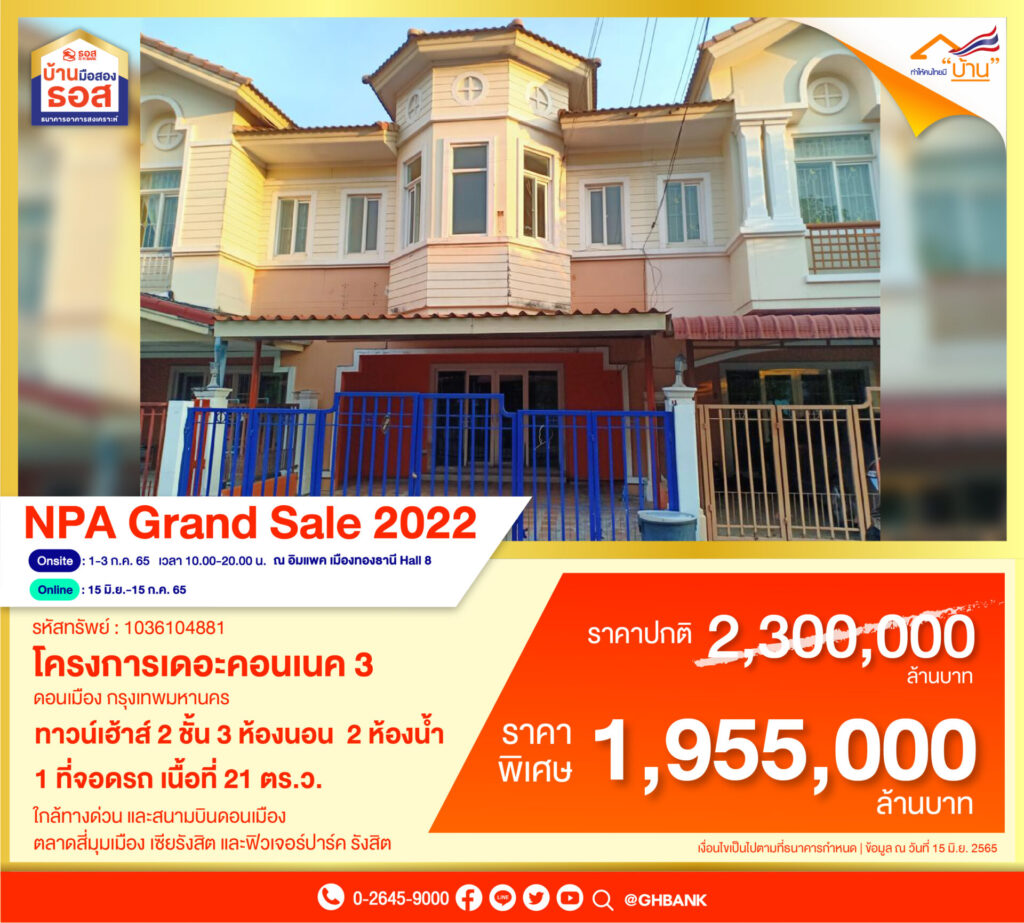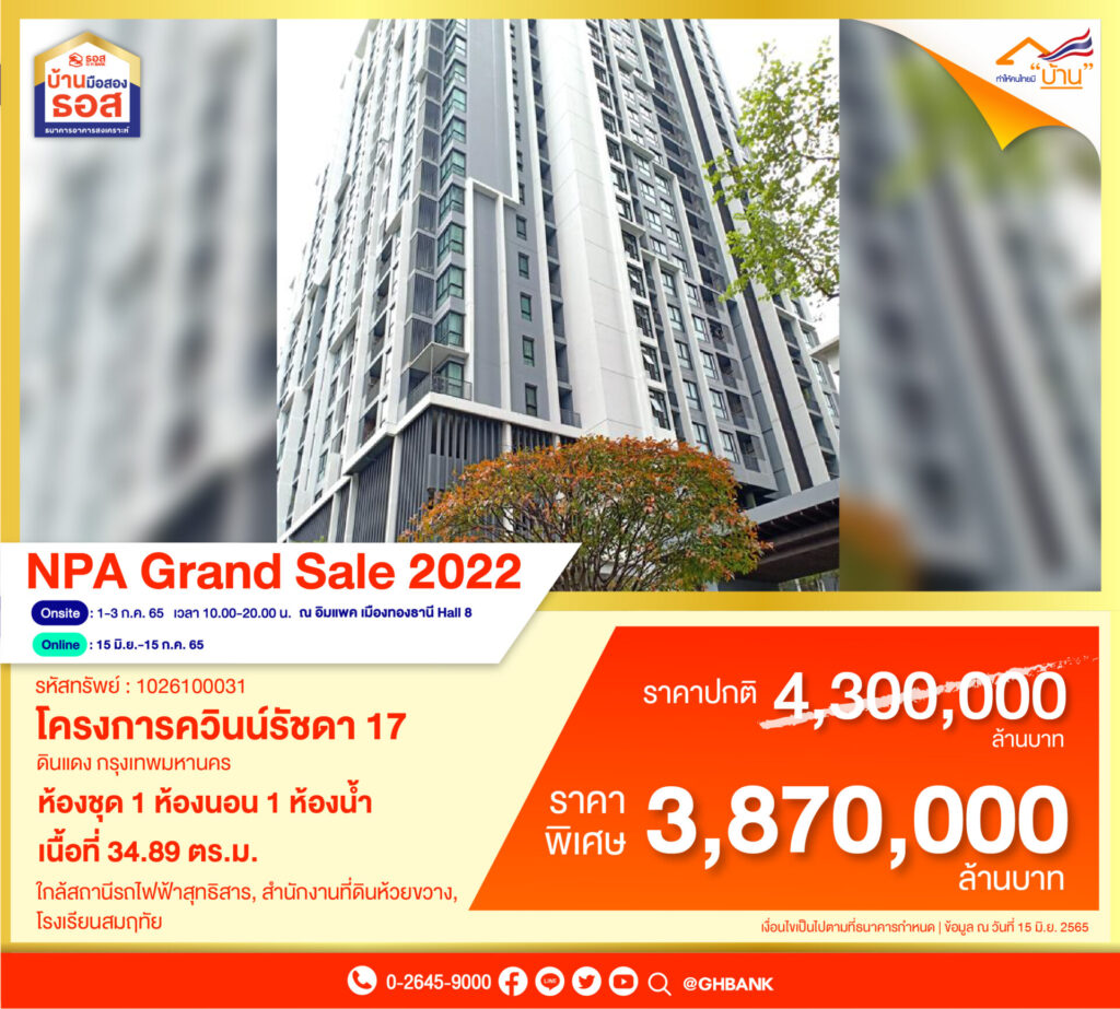 ธนาคารอาคารสงเคราะห์ (ธอส.) ร่วมออกบูธในงาน มหกรรมสินเชื่อบ้าน และบ้านมือสองแห่งปี : NPA Grand Sale 2022 นำบ้านมือสองคุณภาพดี ทำเลเด่น และราคาคุ้มค่ารวมกว่า 400 รายการ ในพื้นที่กรุงเทพฯ และปริมณฑล รวมถึงจังหวัดพระนครศรีอยุธยาทั้งประเภทบ้านเดี่ยว บ้านแฝด ทาวน์เฮ้าส์ และห้องชุด (คอนโดมิเนียม) มอบส่วนลดสูงสุดถึง 40% จากราคาปกติ โดยทรัพย์ที่มีราคาขายต่ำสุดเริ่มต้นเพียงแค่ 100,000 บาท คือ คอนโดมิเนียม ชั้น 5 จาก 5 ชั้น เนื้อที่ 23.62 ตารางเมตร ในโครงการคูณเจริญคอนโดทาวน์ อ.บางพลี จ.สมุทรปราการ ขณะที่ทรัพย์เด่นทำเลดีที่น่าสนใจ ได้แก่ บ้านแฝด เนื้อที่ 45 ตารางวา ในโครงการลภาวัน 21 อ.ปากเกร็ด จ.นนทบุรี ราคาจำหน่าย 3,510,000 บาท โดยเป็นทรัพย์ที่อยู่ในกลางเมืองนนทบุรี เดินทางได้หลายเส้นทาง และใกล้สิ่งอำนวยความสะดวกมากมาย อาทิ โรงเรียน โรงพยาบาล และห้างสรรพสินค้า และคอนโดมิเนียม เนื้อที่ 34.89 ตารางเมตร ในโครงการควินน์รัชดา 17 เขตดินแดง กรุงเทพฯ ราคาจำหน่าย 3,870,000 บาท ซึ่งเป็นทรัพย์ที่ตั้งอยู่ห่างจากรถไฟฟ้าใต้ดิน MRT สถานีสุทธิสารเพียง 400 เมตรเท่านั้น พิเศษ!! ผู้ซื้อบ้านมือสองของ ธอส. สามารถผ่อนดาวน์ดอกเบี้ย 0% ต่อปี นานสูงสุดถึง 24 เดือนอีกด้วย ผู้ที่สนใจสามารถวางเงินประกันการซื้อเพียง 1,000 บาท สำหรับจองซื้อบ้านมือสองภายในงาน พิเศษ!! ผู้ที่ลงทะเบียนจองซื้อยังจะได้รับกระเป๋าพับอเนกประสงค์ 1 ราย ต่อ 1 ใบฟรีทันที