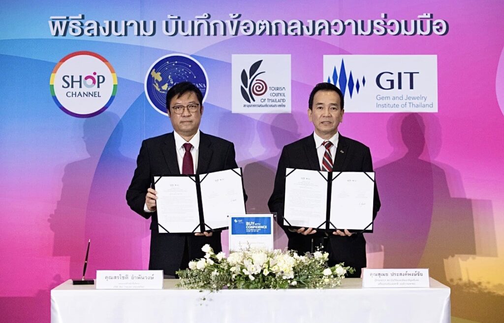นายสุเมธ ประสงค์พงษ์ชัย ผู้อำนวยการ สถาบันวิจัยและพัฒนาอัญมณีและเครื่องประดับแห่งชาติ (องค์การมหาชน) หรือ GIT จับมือ บริษัท ช้อป โกลบอล (ประเทศไทย) จำกัด ลงนามบันทึกความเข้าใจความร่วมมือ “การจัดกิจกรรมภายใต้โครงการซื้อด้วยความมั่นใจ ภายใต้โครงการซื้อด้วยความมั่นใจ Buy with Confidence” สร้างความเชื่อมั่นผู้บริโภคอัญมณีและเครื่องประดับ พร้อมต่อยอดหนุนผู้ประกอบการขยายช่องทางการผ่านแพลตฟอร์ม Home Shopping 24 ชั่วโมง รับเศรษฐกิจคึกคักหลัง COVID-19
