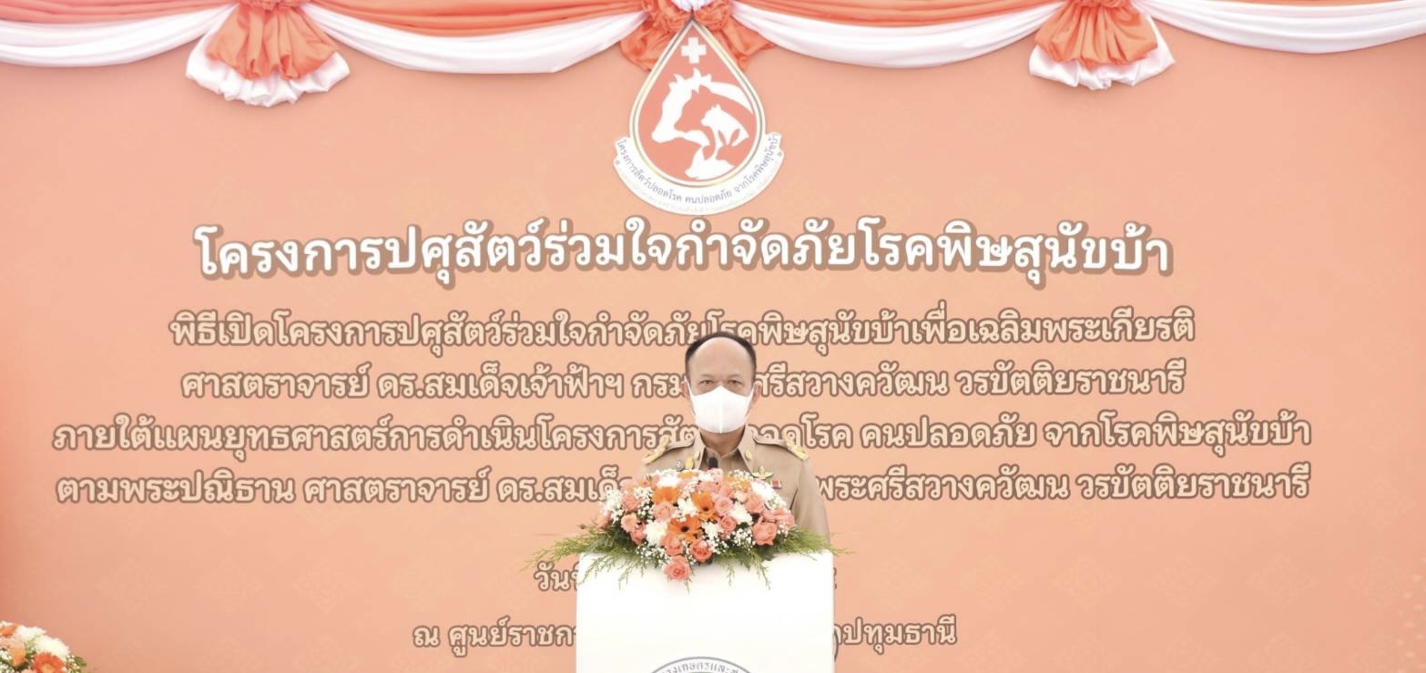 ปทุมธานี 4 ก.ค.- กรมปศุสัตว์จัดพิธีเปิดโครงการปศุสัตว์ร่วมใจกำจัดภัยโรคพิษสุนัขบ้า เพื่อเฉลิมพระเกียรติศาสตราจารย์ ดร.สมเด็จเจ้าฟ้าฯ กรมพระศรีสวางควัฒน วรขัตติยราชนารี ภายใต้โครงการสัตว์ปลอดโรค คนปลอดภัยจากโรคพิษสุนัขบ้า ตามพระปณิธานฯ