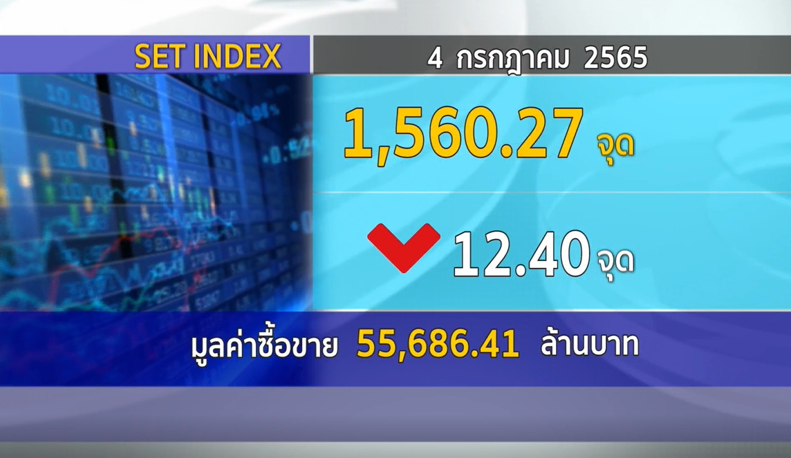 กทม. 4 ก.ค.-ตลาดหลักทรัพย์ ปิดวันนี้ที่ระดับ 1,560.27 จุด ลดลง 12.40 จุด (-0.79%) มูลค่าการซื้อขาย 55,686.41 ล้านบาท กังวลเศรษฐกิจโลกถดถอย