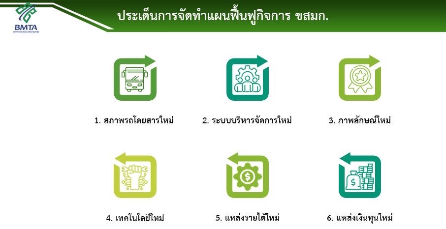 6. แหล่งเงินทุน โดยมีรูปแบบการจัดหารถที่มีความหลากหลาย เช่น การซื้อ การเช่า การจ้างวิ่ง การให้บริการของรถร่วมบริการ การให้เอกชนเข้ามามีส่วนร่วม (PPP) โดย ขสมก.จะได้เร่งจัดทำรายละเอียดแผนฟื้นฟูกิจการ ขสมก. ต่อไป
