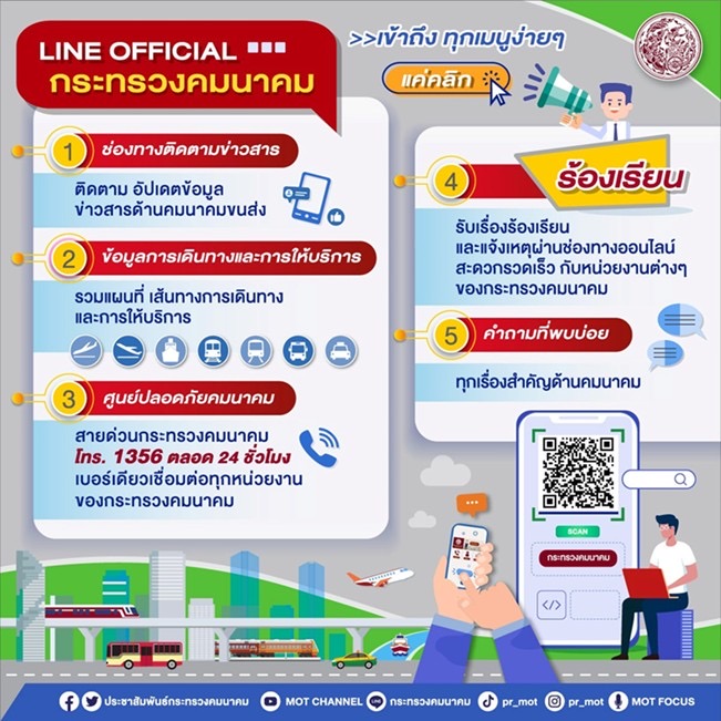 ซึ่งประชาชนจะได้รับรู้ข้อมูลข่าวสารของกระทรวงผ่านสื่อออนไลน์ของกระทรวง (Facebook, Twitter, Instagram, YouTube, TikTok, และ Podcast) ได้อย่างทั่วถึง สะดวก รวดเร็วยิ่งขึ้น และเข้ามามีส่วนร่วมในการแสดงความคิดเห็น เสนอแนะ ติดตามการดำเนินงาน ช่วยให้กระทรวงฯ สามารถดูแลประชาชนได้อย่างใกล้ชิดตลอด 24 ชั่วโมงผ่าน 3 ช่องทาง ได้แก่ 1) MOT Channel ผ่านทาง YouTube เพื่อสร้างการรับรู้ข้อมูลข่าวสารของกระทรวงฯ โดยประชาชนสามารถติดตามความเคลื่อนไหว ข่าวสารสำคัญ เข้าถึงทุกการดำเนินงาน ได้อย่างต่อเนื่อง 2) MOT Public Hearing เป็นช่องทางการสื่อสารกับประชาชนผ่านเว็บไซต์กระทรวงฯ เพื่อแลกเปลี่ยนข้อมูลและรับฟังความคิดเห็นข้อเสนอแนะของประชาชน สร้างการมีส่วนร่วมในทุกแผนงานโครงการ และนโยบายสำคัญเร่งด่วนของรัฐบาลและกระทรวงฯ เพื่อนำไปใช้ในการปรับปรุงการดำเนินงาน และแก้ไขปัญหาของประชาชนอย่างเป็นรูปธรรมต่อไป และ 3) สายด่วน Call Center โทร. 1356 ซึ่งประชาชนสามารถสอบถาม ร้องเรียน และแจ้งเหตุได้ตลอด 24 ชั่วโมง