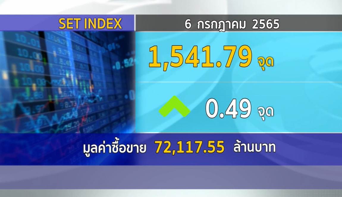 กทม. 6 ก.ค.-ตลาดหลักทรัพย์ ปิดวันนี้ที่ระดับ 1,541.79 จุด เพิ่มขึ้น 0.49 จุด (+0.03%) มูลค่าการซื้อขาย 72,117.55 ล้านบาท