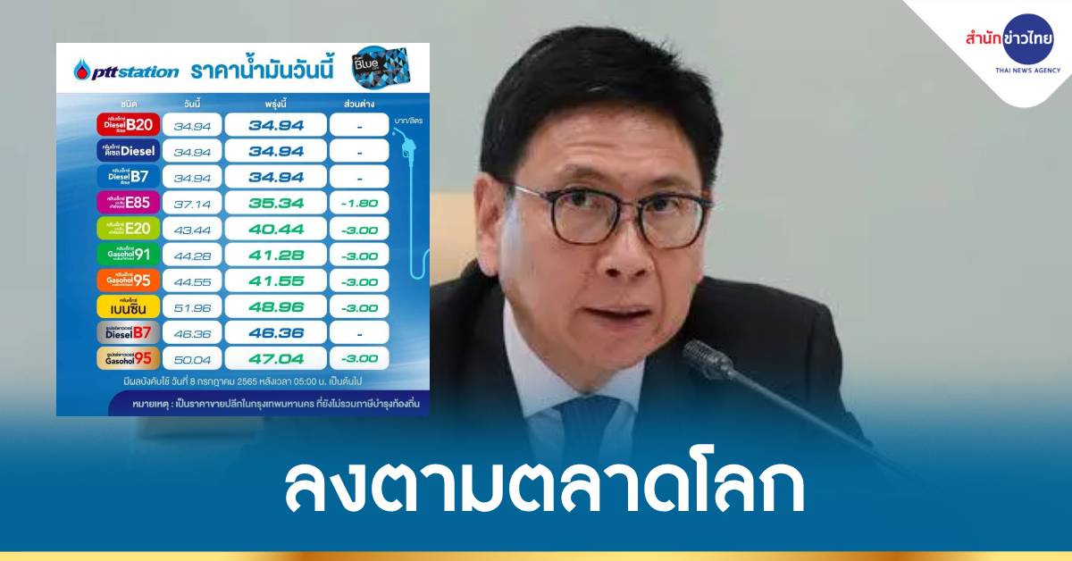 นายกุลิศ สมบัติศิริ ปลัดกระทรวงพลังงานกล่าวว่า ราคาน้ำมันสำเร็จรูปที่ล่าสุด PTT Station, บางจากฯ ประกาศปรับลดราคาขายปลีกกลุ่มเบนซินลง 3.00 บาทต่อลิตร เว้น E85 ลดลง 1.80 บาทต่อลิตร ส่วนกลุ่มดีเซลทุกชนิด คงเดิม มีผล 8 กรกฎาคม 2565 เวลา 05.00 น. เป็นต้นไปนั้น เป็นการลดราคาของผู้ค้าที่ปรับตามกลไกตลาดโลกที่นักลงทุนหวั่นเศรษฐกิจโลกชะลอตัวกระทบดีมานด์น้ำมันประกอบจีนล็อกดาวน์สกัดกั้นโควิด-19 ในหลายเมืองทำให้ราคาน้ำมันดิบเวสต์เท็กซัสลดต่ำกว่า 100 เหรียญสหรัฐ/บาร์เรลราคาน้ำมันสิงคโปร์ลดลงแรงเช่นกัน โดยปิดตลาดวานนี้เบนซินลดลง 17.68 เหรียญ ปิด 129.53 เหรียญ/บาร์เรล ดีเซลดลดลง 13.36 เหรียญ ปิด 140.90 เหรียญ/บาร์เรล
