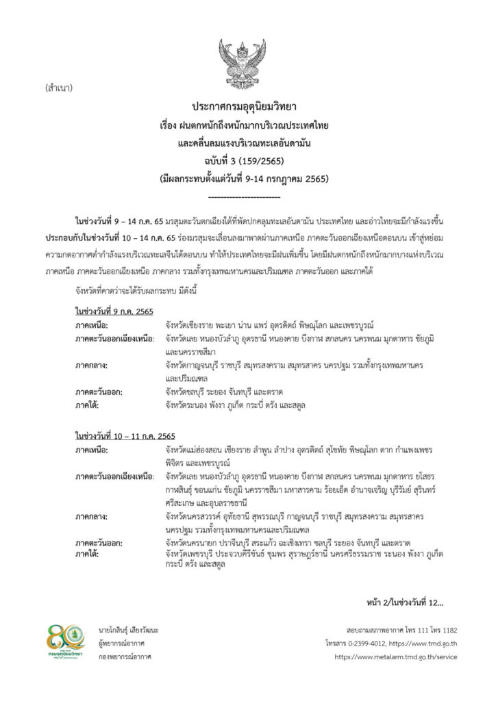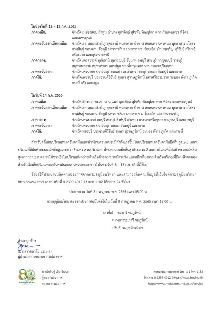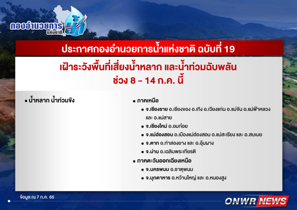 กำลังแรงบริเวณทะเลจีนใต้ตอนบน ทำให้ประเทศไทยจะมีฝนเพิ่มขึ้น โดยมีฝนตกหนักถึงหนักมากบางแห่ง จากการประเมินสถานการณ์น้ำจากฝนคาดการณ์ของกรมอุตุนิยมวิทยาและสถาบันสารสนเทศทรัพยากรน้ำ (องค์การมหาชน) แล้วพบว่า จะมีปริมาณฝนตกสะสมต่อเนื่อง ประกอบกับสถานการณ์น้ำในลำน้ำและแหล่งน้ำธรรมชาติบางพื้นที่ที่มีฝนตกหนักอยู่ในเกณฑ์น้ำมากอาจส่งผลให้เกิดน้ำหลากและน้ำท่วมฉับพลันในช่วงวันที่ 8-14 กรกฎาคม 2565