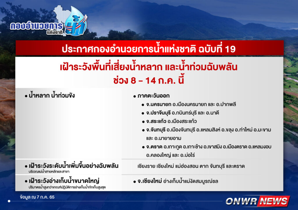 2. เฝ้าระวังระดับน้ำเพิ่มขึ้นอย่างฉับพลัน บริเวณแม่น้ำสายหลักและสาขาในพื้นที่ จ.เชียงราย เชียงใหม่ แม่ฮ่องสอน ตาก จันทบุรี และตราด