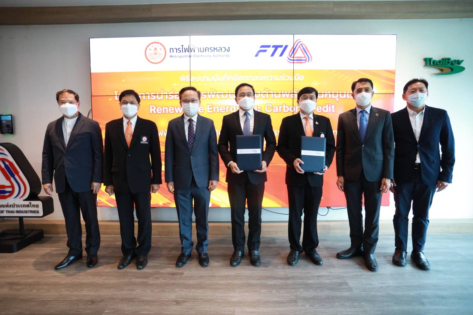 นายนพดล ปิ่นสุภา รองประธานสภาอุตสาหกรรมแห่งประเทศไทย และ ประธานสถาบันพลังงานเพื่ออุตสาหกรรม พร้อมด้วย นายวีรวัจน์ บัวทอง รองผู้ว่าการยุทธศาสตร์องค์กรและความยั่งยืน การไฟฟ้านครหลวง ดร.บัณฑูร เศรษฐศิโรตม์ คณะกรรมการกำกับกิจการพลังงาน (กกพ.) ดร.กิติพงค์ พร้อมวงค์ สำนักงานสภานโยบายการอุดมศึกษา วิทยาศาสตร์ วิจัยและนวัตกรรมแห่งชาติ ร่วมประกาศความร่วมมือขับเคลื่อนโครงการฯ