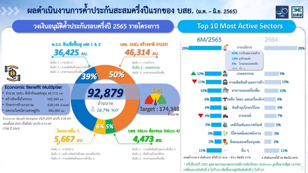 นายสิทธิกร ดิเรกสุนทร กรรมการและผู้จัดการทั่วไป บรรษัทประกันสินเชื่ออุตสาหกรรมขนาดย่อม (บสย.) เปิดเผยผลดำเนินงานค้ำประกันสินเชื่อ บสย. รอบ 6 เดือน (1 ม.ค.-30 มิ.ย. 2565) อนุมัติวงเงินค้ำประกันสินเชื่อ รวม 92,879 ล้านบาท โดยยอดค้ำประกันร้อยละ 50 มาจากโครงการค้ำประกันสินเชื่อ บสย. SMEs สร้างชาติ (PGS 9) วงเงิน 46,314 ล้านบาท โครงการค้ำประกันสินเชื่อ พ.ร.ก.ฟื้นฟู สัดส่วน 39% วงเงิน 36,425 ล้านบาท และโครงการค้ำประกันสินเชื่อ บสย. Micro ต้องชนะ (Micro 4) สัดส่วน 5% วงเงิน 4,473 ล้านบาท และโครงการอื่น ๆ สัดส่วน 6% วงเงิน 5,667 ล้านบาท