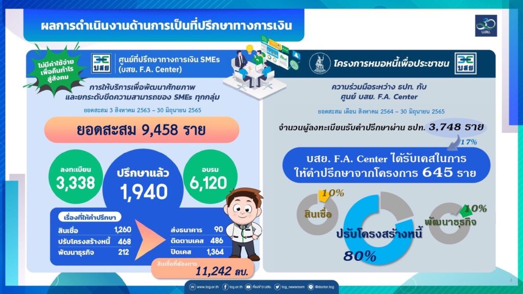 ในรอบ 6 เดือน โครงการค้ำประกันสินเชื่อ บสย. SMEs สร้างชาติ (PGS 9) วงเงิน 150,000 ล้านบาท เป็นโครงการตามมาตรการรัฐ โดยสนับสนุนจ่ายชดเชยค่าธรรมเนียมค้ำประกันแทนผู้ประกอบการ SMEs ด้วยเงื่อนไขการค้ำประกันดีที่สุดเท่าที่เคยมีมา ฟรีค่าธรรมเนียมค้ำประกันสูงสุด 3 ปี ระยะเวลาการค้ำ 10 ปี และได้รับความนิยมจากสถาบันการเงิน โดยสิ้นสุดโครงการ ในวันที่ 30 พฤศจิกายน 2565 บสย.ยังร่วมกับธนาคารแห่งประเทศไทย (ธปท.) ให้คำปรึกษาผู้ประกอบการที่มีปัญหาหนี้ ผ่านโครงการหมอหนี้เพื่อประชาชน ณ 30 มิถุนายน 2565 มีผู้ลงทะเบียนผ่าน ธปท. 3,748 ราย ซึ่งได้ส่งต่อให้ บสย.ให้คำปรึกษา จำนวน 645 ราย ส่วนใหญ่เป็นการปรับโครงสร้างหนี้ธุรกิจมากถึง 80%