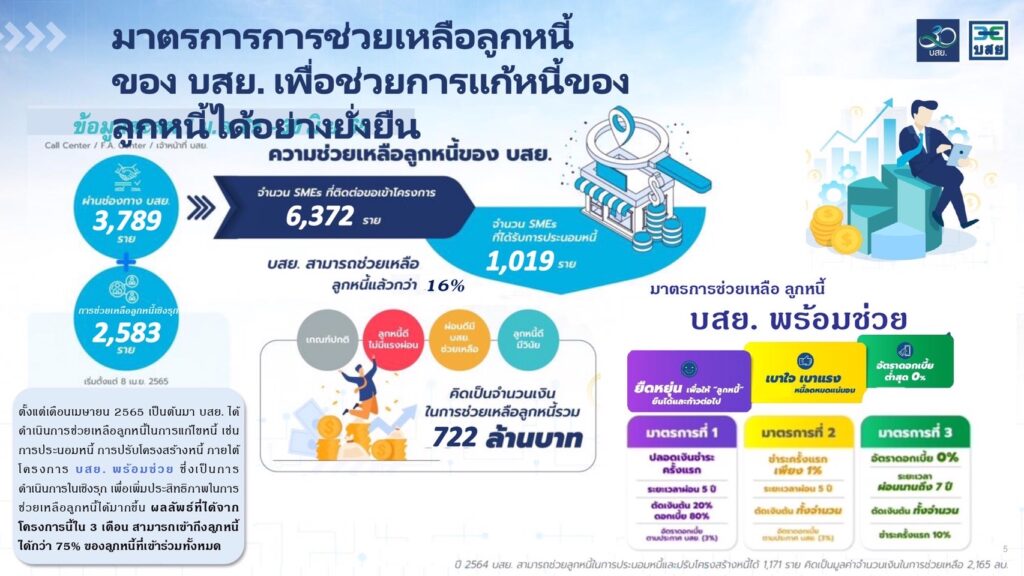 บสย. ยังเดินหน้าช่วยเหลือลูกหนี้ บสย. ภายใต้โครงการ “บสย. พร้อมช่วย” แก้หนี้อย่างยั่งยืน เช่น การประนอมหนี้ การปรับโครงสร้างหนี้ มาตรการที่ 1 (สีม่วง) ยืดหยุ่น เพื่อให้ “ลูกหนี้” ยืนได้และก้าวต่อไป ตัดต้น 20% ดอกเบี้ย 80% ผ่อนนาน 5 ปี มาตรการที่ 2 (สีเหลือง) เบาใจ เบาแรง “หนี้ลดหมดแน่นอน” ชำระครั้งแรก 1% ตัดเงินต้นทั้งจำนวน ผ่อนนาน 5 ปี และมาตรการที่ 3 (สีเขียว) ชำระครั้งแรก 10% ตัดเงินต้นทั้งจำนวน ดอกเบี้ย 0% ผ่อนนาน 7 ปี โดยทั้ง 3 มาตรการมีลูกหนี้ติดต่อเข้ารับการประนอมหนี้และปรับโครงสร้างหนี้ 6,372 ราย สามารถช่วยเหลือลูกหนี้ผ่านมาตรการต่าง ๆ ของ บสย. แล้ว 1,019 ราย คิดเป็นสัดส่วนความสำเร็จของการช่วยเหลือ (Success Rate) 16% คิดเป็นวงเงินประนอมหนี้ 722 ล้านบาท ผลลัพธ์ที่ได้จากโครงการ สามารถเข้าถึงลูกหนี้ได้กว่า 75% ของลูกหนี้ที่เข้าร่วมทั้งหมด โครงการ “บสย. พร้อมช่วย” แก้หนี้อย่างยั่งยืน พร้อมให้ความช่วยเหลือลูกหนี้ บสย. โดยเปิดช่องทางการส่งคำขอปรับโครงสร้างหนี้ มาที่ บสย. ได้ทุกช่องทาง ทั้ง Call Center 02-890-9999