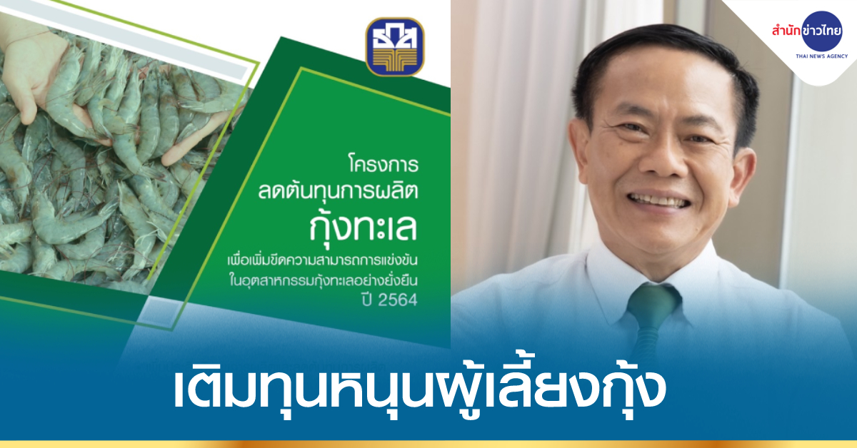 นายสมเกียรติ กิมาวหา รองผู้จัดการธนาคารเพื่อการเกษตรและสหกรณ์การเกษตร (ธ.ก.ส.) เปิดเผยว่า จากสถานการณ์การแพร่ระบาดของเชื้อไวรัส COVID-19 และภาวะเศรษฐกิจถดถอย ส่งผลกระทบต่อการประกอบอาชีพของเกษตรกรผู้เลี้ยงกุ้ง เนื่องด้วยต้นทุนการผลิตที่เพิ่มสูงขึ้น ทั้งด้านอาหาร พลังงาน และปัจจัยที่ก่อให้เกิดโรคในกุ้งทะเล ทำให้การผลิตและส่งออกกุ้ง ทั้งขนาดและปริมาณไม่เป็นไปตามความต้องการของตลาด จากปัญหาดังกล่าว รัฐบาลจึงวางนโยบายในการแก้ไขปัญหาในภาคการผลิตของอุตสาหกรรมกุ้งทะเลอย่างยั่งยืน ด้วยการเพิ่มประสิทธิภาพการผลิตต่อหน่วย และลดต้นทุนการผลิต ด้วยการนำนวัตกรรมและเทคโนโลยีมาใช้ในการปรับปรุงโครงสร้างฟาร์ม เป็นต้น ธ.ก.ส. จึงได้ขยายโครงการลดต้นทุนการผลิตกุ้งทะเล เพื่อเพิ่มขีดความสามารถการแข่งขันในอุตสาหกรรมกุ้งทะเลอย่างยั่งยืน ปี 2564 (เพิ่มเติม) เพื่อสนับสนุนเกษตรกรผู้เลี้ยงกุ้งให้เข้าถึงเงินทุนในอัตราดอกเบี้ยต่ำ ป้องกันการก่อหนี้นอกระบบที่มีอัตราดอกเบี้ยสูงอย่างไม่เป็นธรรม อันเป็นการเพิ่มประสิทธิภาพในการประกอบอาชีพและการแข่งขันกับประเทศผู้ผลิตอื่น
