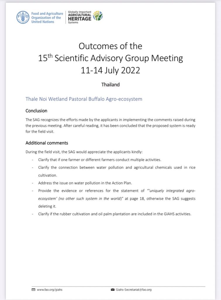 นายทองเปลว กองจันทร์ ปลัดกระทรวงเกษตรและสหกรณ์กล่าวว่า ได้รับรายงานจากสำนักงานที่ปรึกษาการเกษตรต่างประเทศประจำกรุงโรมเกี่ยวกับผลการพิจารณาขององค์การอาหารและเกษตรแห่งสหประชาชาติ (FAO) ณ กรุงโรมซึ่งได้ตรวจเอกสารใบสมัครมรดกโลก (GIAHS) ฉบับปรับปรุงแก้ไข ตามที่กระทรวงเกษตรและสหกรณ์เสนอให้ FAO รับรอง “การเลี้ยงควายและระบบเกษตรเชิงนิเวศทะเลน้อย” เป็น “มรดกทางการเกษตรโลก” (Globally Important Agricultural Heritage System หรือ GIAHS) โดยคณะกรรมการวิทยาศาสตร์ของ FAO ได้ประชุมพิจารณาระหว่างวันที่ 11-14 กรกฎาคมที่ผ่านมา ซึ่งผลปรากฏว่า ผ่านการพิจารณาเรียบร้อยแล้ว จากนั้นคณะกรรมการวิทยาศาสตร์ของ FAO เตรียมเดินทางมายังประเทศไทยเพื่อตรวจประเมินพื้นที่ “ทะเลน้อย” ภายในเดือนตุลาคม โดยทาง FAO จะแจ้งรายละเอียดเพิ่มเติมให้ทราบภายใน 2-3 สัปดาห์นี้