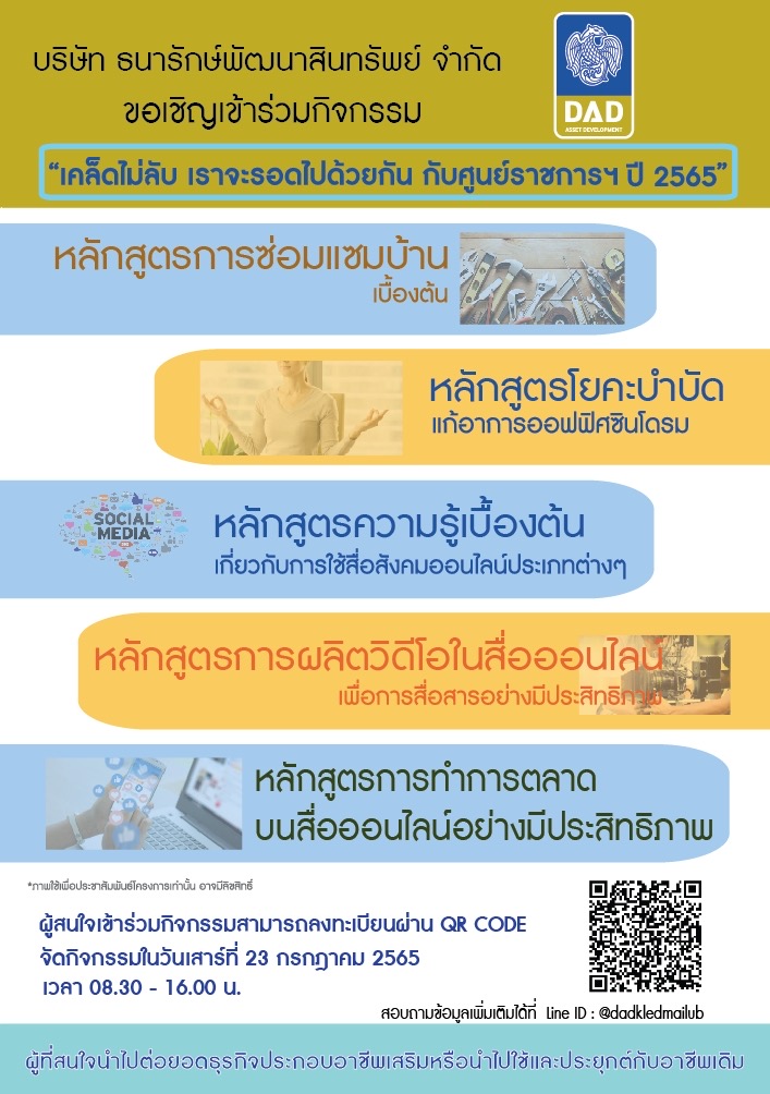 นอกจากนี้ DAD ยังมีแนวคิดในการส่งเสริมการสร้างงาน สร้างอาชีพ เพื่อเพิ่มพูนทักษะและรายได้ให้กับชุมชน ผู้ที่กำลังว่างงาน หรือผู้ที่สนใจ จึงได้เปิดตัวโครงการ “เคล็ดไม่ลับ เราจะรอดไปด้วยกัน กับศูนย์ราชการฯ ปี 2565” นำร่องด้วย 5 หลักสูตรออนไลน์ระยะสั้น โดยไม่มีค่าใช้จ่าย เพื่อเป็นการส่งเสริมพัฒนาความรู้ความสามารถใช้เป็นเครื่องมือในการประกอบอาชีพหาเลี้ยงดูตนเองและครอบครัวได้ ประกอบด้วย 5 หลักสูตร ได้แก่ 1. หลักสูตรการซ่อมแซมบ้านเบื้องต้น 2. หลักสูตรโยคะบำบัดแก้อาการออฟฟิศซินโดรม 3. หลักสูตรความรู้เบื้องต้นเกี่ยวกับการใช้สื่อสังคมออนไลน์ประเภทต่าง ๆ 4. หลักสูตรการผลิตวิดีโอในสื่อออนไลน์เพื่อการสื่อสารอย่างมีประสิทธิภาพ และ 5. หลักสูตรการทำการตลาดบนสื่อออนไลน์อย่างมีประสิทธิภาพ ผู้ที่สนใจสามารถลงทะเบียนได้ตั้งแต่วันนี้เป็นต้นไปได้ที่ Line @dadkledmailub หรือสอบถามข้อมูลเพิ่มเติมที่ โทร. 0 2142 2204 โดยกิจกรรมนี้จะจัดขึ้นในวันเสาร์ที่23 กรกฎาคม 2565 ตั้งแต่เวลา 08:30-16:00 น.