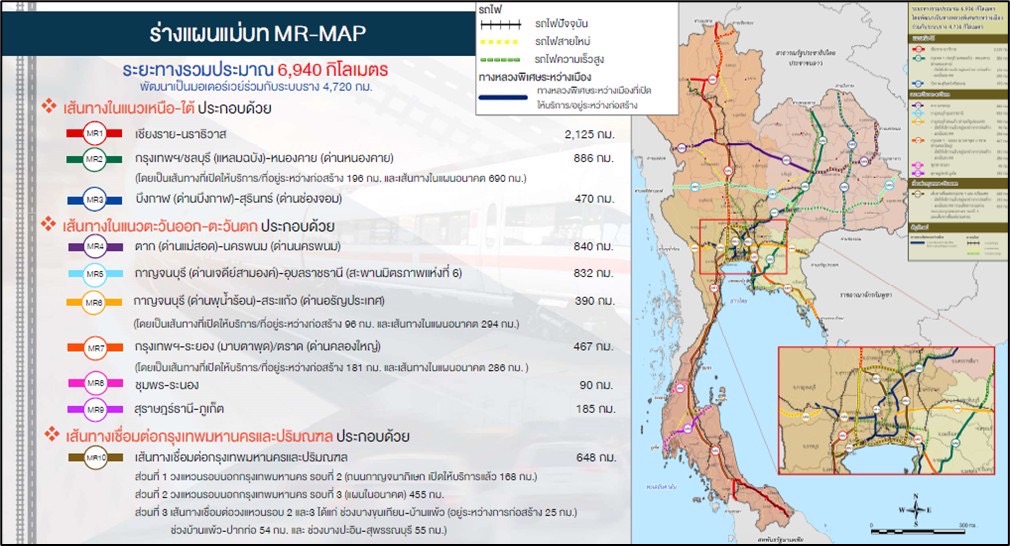 สำหรับตัวอย่างโครงการที่อยู่ระหว่างการพัฒนาตามกรอบแผนแม่บท MR-Map ได้แก่ โครงการ Landbridge ที่รัฐบาลจะไม่ลงทุนพัฒนาโครงสร้างพื้นฐานด้วยเงินงบประมาณแผ่นดินหรือเงินภาษีของประชาชน แต่จะทำการศึกษาเชิง Concept ทางธุรกิจและ การออกแบบในกรอบที่เรียกว่า Definitive Design ให้มีข้อมูลเพียงพอก่อนที่จะออกเชิญชวน Roadshow ให้กลุ่มนักธุรกิจและนักลงทุนผู้ประกอบการ ด้าน Logistics ทั้งในและต่างประเทศระดับโลก ให้เห็นถึงโอกาส เพื่อเชิญชวนมาเป็นผู้ลงทุนทั้งการพัฒนาโครงสร้างพื้นฐานและการบริหารธุรกิจการขนส่งโลจิสติกส์ของโครงการ