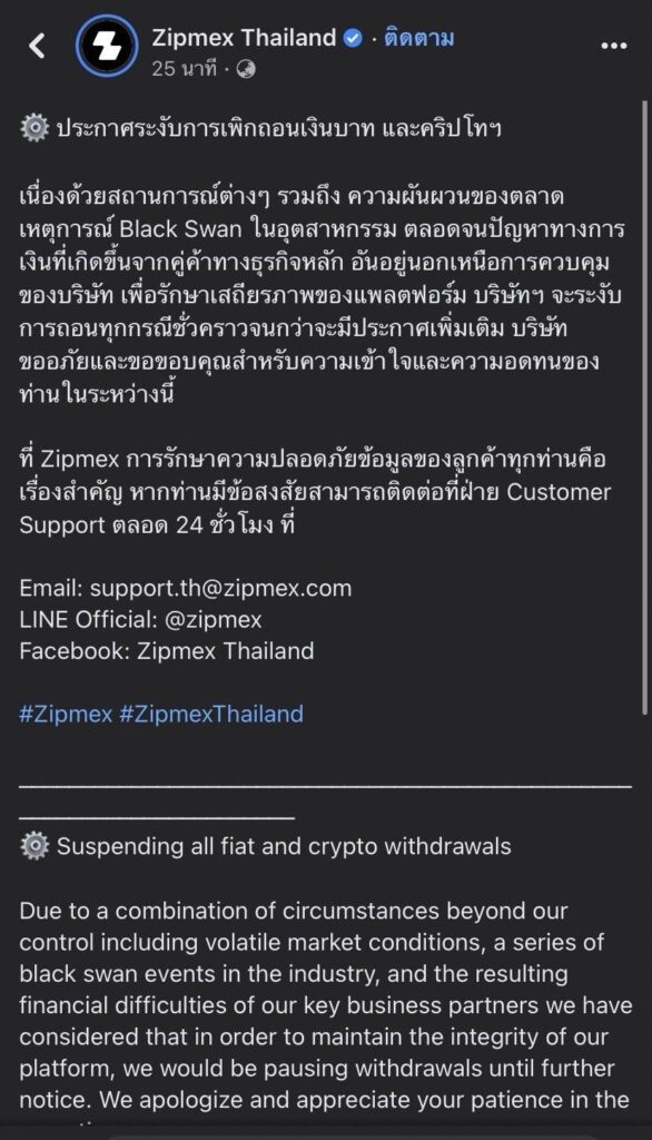 ซิปเม็กซ์ (Zipmex) ประกาศทางหน้าเพจเฟซบุ๊ก วันนี้ (20 ก.ค.) ขอระงับการเพิกถอนเงินบาท และคริปโตฯ เนื่องด้วยสถานการณ์ต่างๆ รวมถึง ความผันผวนของตลาด เหตุการณ์ต่างๆในอุตสาหกรรม ตลอดจนปัญหาทางการเงินที่เกิดขึ้นจากคู่ค้าทางธุรกิจหลัก อันอยู่นอกเหนือการควบคุมของบริษัท เพื่อรักษาเสถียรภาพของแพลตฟอร์ม บริษัทฯ จะระงับการถอนทุกกรณีชั่วคราวจนกว่าจะมีประกาศเพิ่มเติม บริษัทขออภัยและขอขอบคุณสำหรับความเข้าใจและความอดทนของท่านในระหว่างนี้