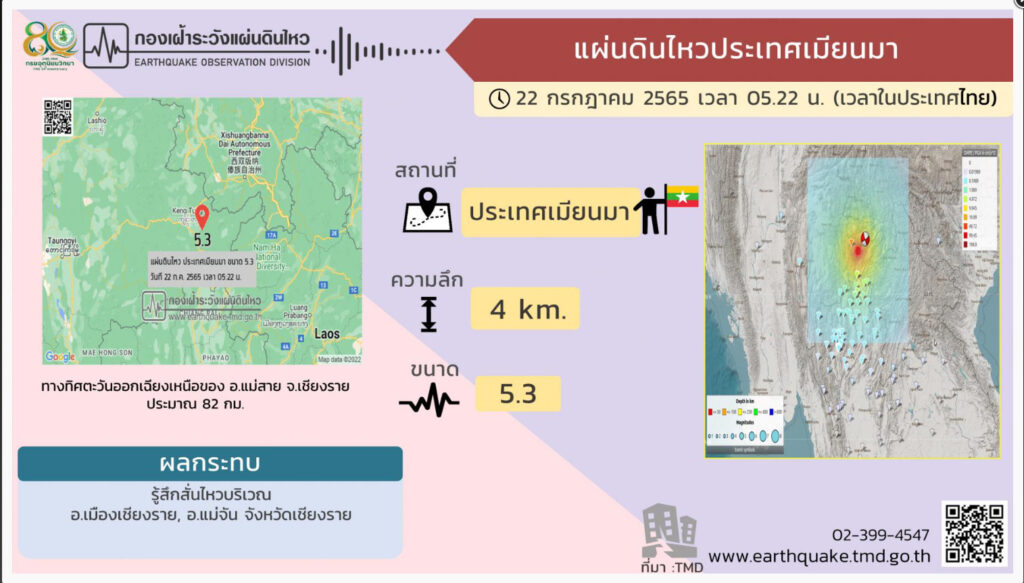 กรุงเทพฯ 22 ก.ค. กรมทรัพยากรธรณีเผย เกิดแผ่นดินไหวในรัฐฉานของเมียนมาในเวลา 00.07 น. จุดศูนย์เกิดแผ่นดินไหวห่างจาก อ.แม่สาย จ.เชียงราย ประมาณ 87 กิโลเมตร เหตุกลุ่มรอยเลื่อน Wan Ha เลื่อนตัว โดยเป็นแผ่นดินขนาดใหญ่ที่สุดในรอบ 20 ปีที่เกิดจากรอยเลื่อนนี้ มีรายงานรับถึงรู้แรงสั่นสะเทือนในหลายจังหวัดของภาคเหนือตอนบน กองเฝ้าระวังแผ่นดินไหว กรมอุตุนิยมวิทยารายงานว่า เกิดแผ่นดินไหวในเมียนมาอีกครั้ง เวลา 05:22 น. แจ้งทุกหน่วยเฝ้าระวังต่อเนื่อง
