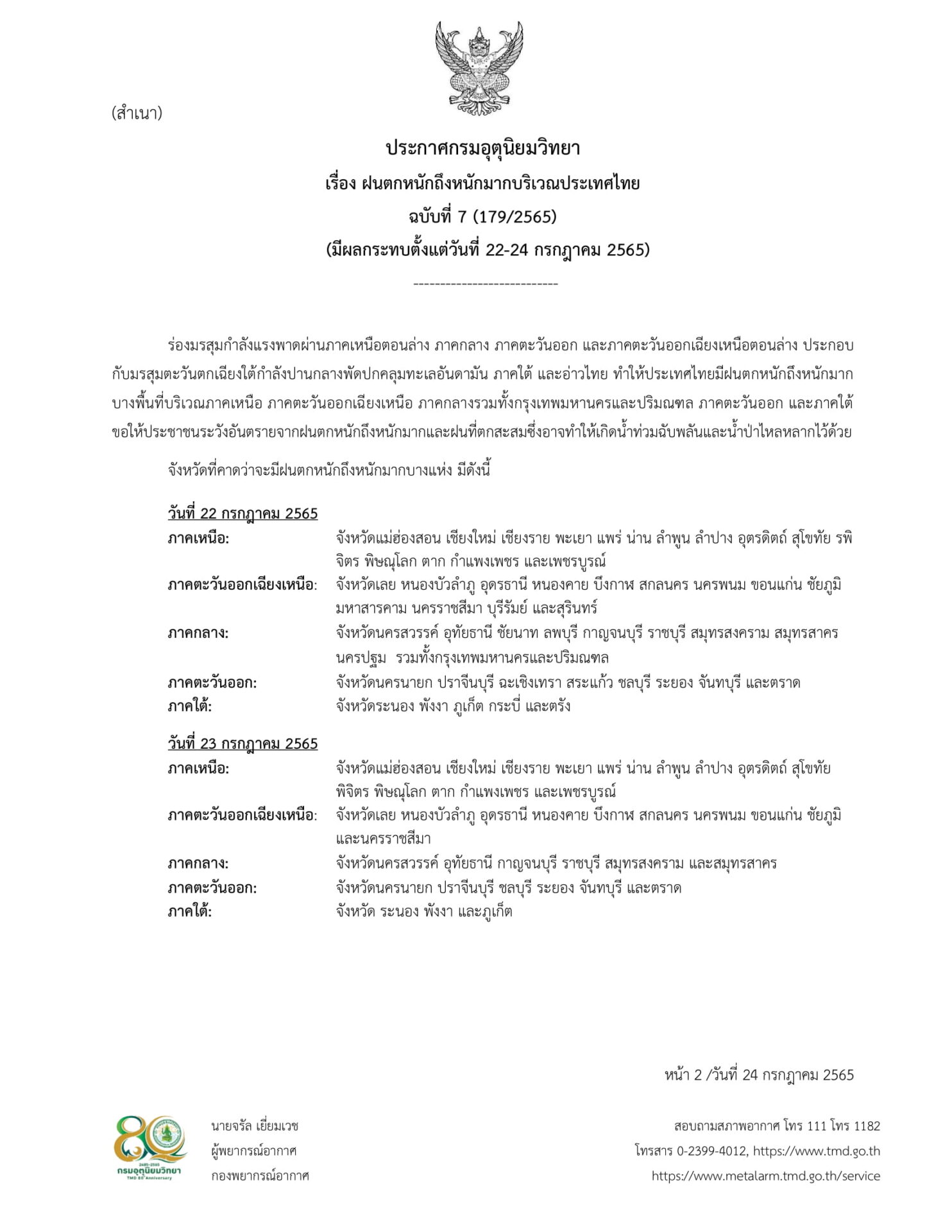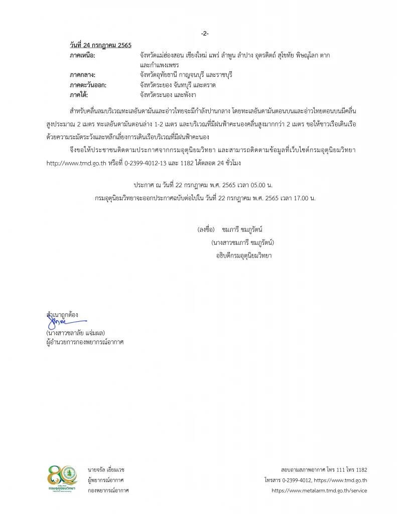 นายประพิศ จันทร์มา อธิบดีกรมชลประทาน เปิดเผยว่าสั่งการให้โครงการชลประทานทั่วประเทศพร้อมรับสถานการณ์น้ำตามที่กรมอุตุนิยมวิทยาคาดการณ์และกองอำนวยการน้ำแห่งชาติ (กอนช.) ออกประกาศ โดยระบุว่า ระหว่างนี้จนถึงวันที่ 25 ก.ค. 65 มรสุมตะวันตกเฉียงใต้ที่พัดปกคลุมทะเลอันดามัน ประเทศไทย และอ่าวไทยจะมีกำลังแรงขึ้น ประกอบกับมีร่องมรสุมพาดผ่านภาคเหนือ ภาคตะวันออกเฉียงเหนือ และภาคกลางตอนบน ทำให้ประเทศไทยจะมีฝนเพิ่มขึ้น และมีฝนตกหนักถึงหนักมากบางแห่งบริเวณภาคเหนือ ภาคตะวันออกเฉียงเหนือ ภาคกลางรวมทั้งกรุงเทพมหานครและปริมณฑล ภาคตะวันออก และภาคใต้