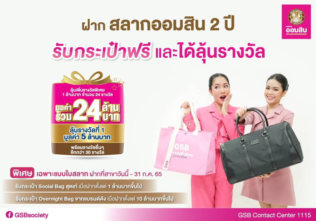 ธนาคารออมสิน กระตุ้นแคมเปญสลากออมสินด้วยการเพิ่มรางวัลพิเศษ 1 ล้านบาท 24 รางวัล สำหรับผู้ที่ฝากสลากออมสินที่สาขา ตั้งแต่วันนี้ จนถึง 31 กรกฎาคม 2565 จะได้รับกระเป๋า 2 แบบ 2 สไตล์ โดยฝาก 1 ล้านบาทขึ้นไป รับกระเป๋า GSB Social Bag สุดเท่ ฝาก 10 ล้านบาทขึ้นไป รับกระเป๋า Elle Overnight Bag ทั้งนี้แคมเปญดังกล่าว จะออกรางวัลพิเศษครั้งแรก 6 รางวัลในวันที่ 1 สิงหาคม 2565 นี้ รวมถึงการลุ้นถูกรางวัลที่ 1 จำนวนเงิน 5,000,000 บาท และรางวัลอื่น ๆ อีกกว่า 30 รางวัล ในทุกวันที่ 1 ของเดือน จำนวน 24 ครั้ง และสิทธิ์ลุ้นถูกรางวัลพิเศษ 1 ล้านบาท อีก 2 ครั้ง ในวันที่ 1 กันยายน 2565 จำนวน 8 รางวัล และ วันที่ 1 ตุลาคม 2565 อีก 10 รางวัล.-สำนักข่าวไทย