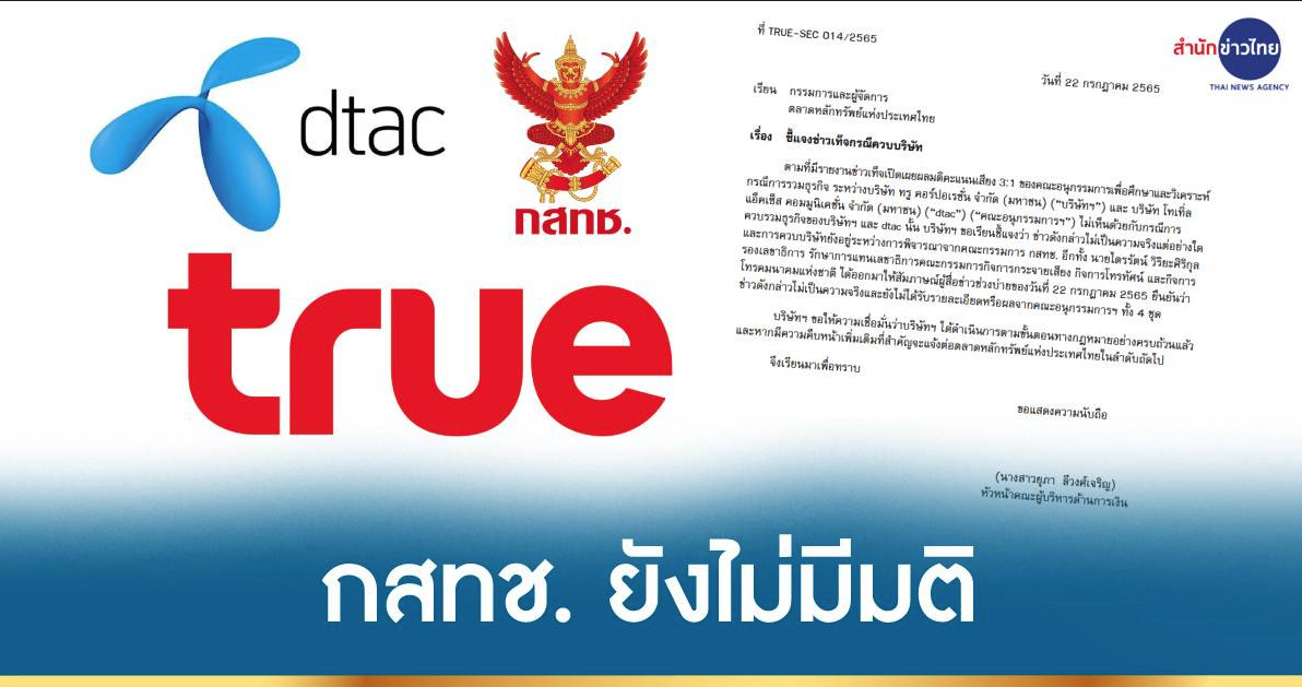 ทรูแจ้งตลาดหลักทรัพย์แห่งประเทศไทย โดยชี้แจงข้อเท็จจริงกรณีควบบริษัท ระบุว่า ตามที่มีรายงานข่าวเท็จเปิดเผยผลมติคะแนนเสียง 3:1 ของคณะอนุกรรมการเพื่อศึกษาและวิเคราะห์กรณีการรวมธุรกิจ ระหว่างบริษัท ทรู คอร์ปอเรชั่น จํากัด (มหาชน) และบริษัท โทเทิ่ล แอ็คเซ็ส คอมมูนิเคชั่น จํากัด (มหาชน) (“คณะอนุกรรมการฯ”) ไม่เห็นด้วยกับกรณีการควบรวมธุรกิจของบริษัทฯ และ dtac บริษัทฯ ขอเรียนชี้แจงว่า ข่าวดังกล่าวไม่เป็นความจริงแต่อย่างใด และการควบบริษัทยังอยู่ระหว่างการพิจารณาจากคณะกรรมการ กสทช. อีกทั้งนายไตรรัตน์ วิริยะศิริกุล รองเลขาธิการ รักษาการแทนเลขาธิการคณะกรรมการกิจการกระจายเสียง กิจการโทรทัศน์ และกิจการโทรคมนาคมแห่งชาติ ได้ออกมาให้สัมภาษณ์ ยืนยันว่าข่าวดังกล่าวไม่เป็นความจริง และยังไม่ได้รับรายละเอียดหรือผลจากคณะอนุกรรมการฯ ทั้ง 4 ชุด