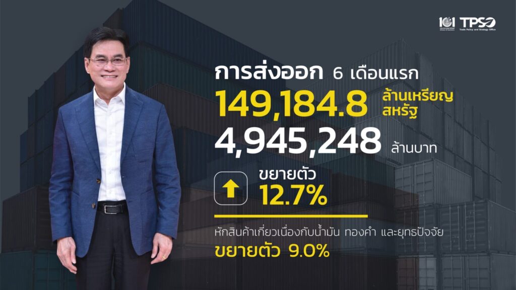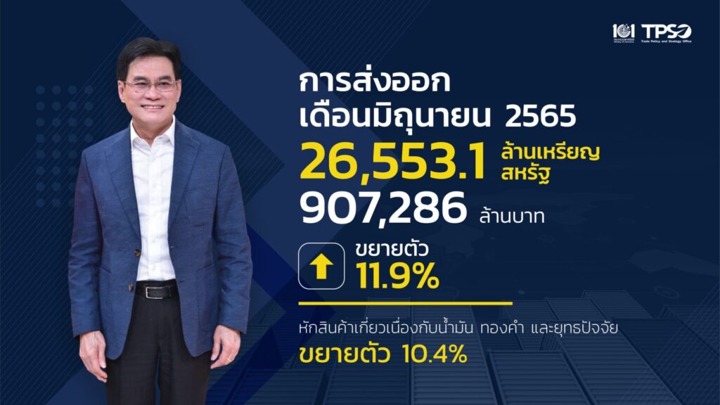 นายจุรินทร์ ลักษณวิศิษฐ์ รองนายกรัฐมนตรีและรัฐมนตรีว่าการกระทรวงพาณิชย์ เปิดเผยถึงสถิติการส่งออกของประเทศในช่วงเดือนมิถุนายน 2565 พบว่า การส่งออกขยายตัว 11.9% คิดเป็นมูลค่ากว่า 26,553 ล้านดอลลาร์สหรัฐ หรือคิดเป็นเงินบาท กว่า 9.07 แสนล้านบาท ในขณะที่การส่งออกในช่วง 6 เดือนแรกของปี ขยายตัว 12.7% คิดเป็นมูลค่ากว่า 149,184 ล้านดอลลาร์สหรัฐ หรือคิดเป็นเงินบาท 4.9 ล้านล้านบาทโดยสินค้าที่ขยายตัวได้ดี คือสินค้าเกษตร อุตสาหกรรมการเกษตร และสินค้าอุตสาหกรรม โดยสินค้าเกษตรในช่วงเดือนมิถุนายน ขยายตัว 21.7% และในช่วง 6 เดือนแรก ขยายตัว 9.3% โดนสินค้าที่ขายดี ได้แก่ สินค้าข้าว ผลไม้สดแช่เย็นแช่แข็ง ไก่สดแช่เย็นแช่แข็ง ยาง สินค้าอุตสาหกรรมการเกษตรเดือนมิถุนายน ขยายตัว 28.3% ช่วง 6 เดือนแรกของปี ขยายตัว 27.9% สินค้าที่ขายดี ได้แก่ น้ำตาลทราย อาหารทะเลกระป๋องและแปรรูป อาหารสัตว์เลี้ยง สินค้าอุตสาหกรรมเดือนมิถุนายนขยายตัว 6.7% ช่วง 6 เดือนแรกขยายตัว 3.8%