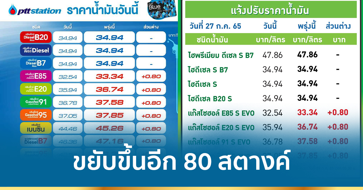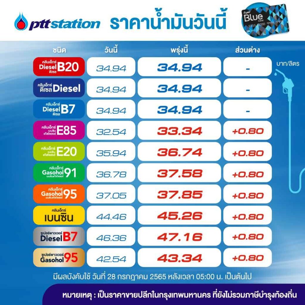 PTT Station ปรับราคาขายปลีกน้ำมันกลุ่มเบนซินและแก๊สโซฮอล์ทุกชนิดขึ้น 0.80 บาท/ลิตร และพรีเมี่ยมดีเซล B7 เพิ่มขึ้น 0.80 บาท/ลิตร นอกนั้นคงเดิม มีผล 28 ก.ค. 2565 เวลา 05.00 น. เป็นต้นไป โดยราคาขายปลีกจะเป็นดังนี้ ULG = 45.26, GSH95 = 37.85, E20 = 36.74, GSH91 = 37.58, E85 = 33.34, พรีเมี่ยม GSH95 = 43.34, HSD-B7 = 34.94, HSD-B10 = 34.94, HSD-B20 = 34.94, พรีเมี่ยมดีเซล B7 = 47.16 บาทต่อลิตร โดยราคาขายปลีกข้างต้นยังไม่รวมภาษีบำรุงกรุงเทพมหานคร