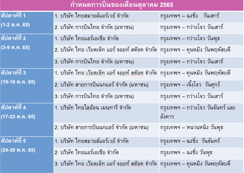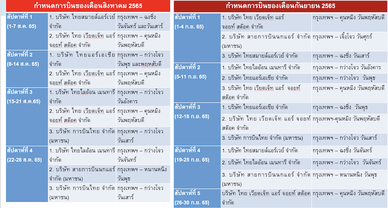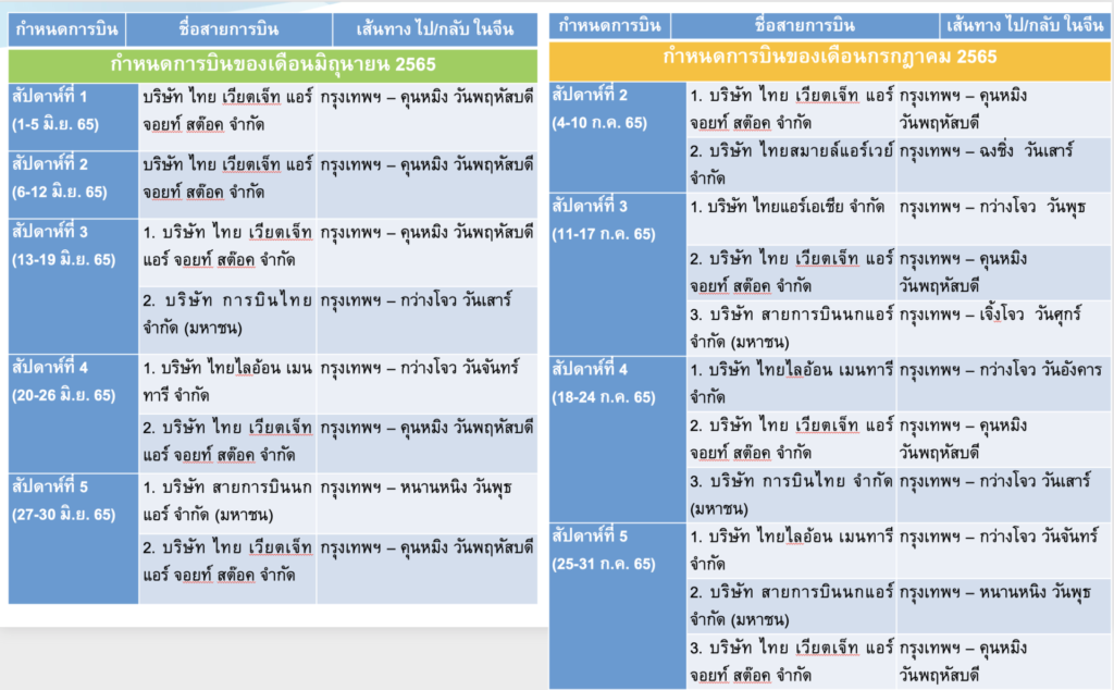 ทั้งนี้ สำหรับกลุ่มผู้โดยสารชาวจีน ปัจจุบันรัฐบาลจีนเริ่มผ่อนคลายมาตรการการเดินทางระหว่างประเทศกับไทย แต่ยังคงอนุญาตให้เฉพาะการเดินทางที่จำเป็นในกลุ่มนักธุรกิจ นักเรียนและนักศึกษา โดยสำนักงานการบินพลเรือนแห่งสาธารณรัฐประชาชนจีน (CAAC) อนุญาตให้สายการบินของไทยและจีน ทำการบินแบบประจำรับขนส่งผู้โดยสารระหว่างไทยกับจีนฝ่ายละ 3 เที่ยวต่อสัปดาห์ ช่วงเดือนกรกฎาคม – ตุลาคม 2565 โดยจากจำนวนเที่ยวบินจะยังไม่ส่งผลมากต่อการเพิ่มปริมาณผู้โดยสารที่เดินทางเข้า-ออกประเทศไทย แต่ถือเป็นสัญญาณที่ดีสำหรับการเดินทางระหว่างประเทศกับกลุ่มตลาดใหญ่อย่างจีน และเป็นจุดเริ่มต้นให้ สายการบินของไทยได้เตรียมความพร้อมตามมาตรการสาธารณสุขของจีนด้วย หากสายการบินของไทยดำเนินการไปได้ด้วยดี ทางการจีนอาจเพิ่มจำนวนเที่ยวบินให้กับประเทศไทยต่อไป