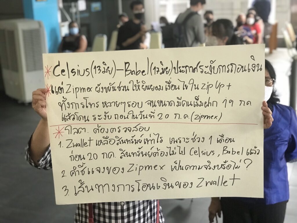 จากกรณีแพลตฟอร์ม “Zipmex” หรือศูนย์ซื้อขายสินทรัพย์ดิจิทัล ของบริษัท ซิปเม็กซ์ จำกัดประกาศระงับการเพิกถอนเงินบาท และคริปโตเคอร์เรนซี เนื่องจากได้รับความเสียหายจากผลิตภัณฑ์ Zipup+ ของลูกค้าถูกนำไปฝากไว้ที่ Zipmex global สิงคโปร์ และนำไปลงทุนกับ Babel Finance และ Celsius ซึ่งประสบปัปญหาจนไม่สามารถทำธุรกรรมใน Z Wallet ได้ ทำให้นักลงทุนจำนวนมากได้รับความเสียหาย และเมื่อสัปดาห์ที่แล้วได้รวมตัวกันร้อง บช.สอท. และยื่นเรื่องดำเนินคดีที่ DSI เมื่อสัปดาห์ที่ผ่านมา