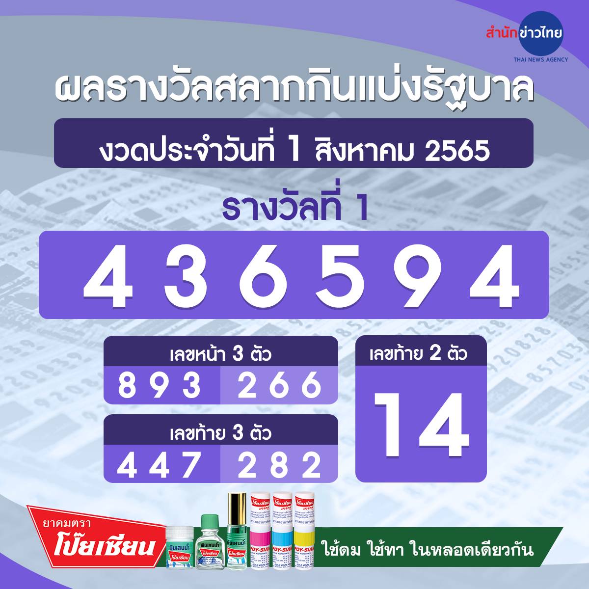 ผลรางวัลสลากกินแบ่งรัฐบาล งวดวันที่ 1 สิงหาคม 2565