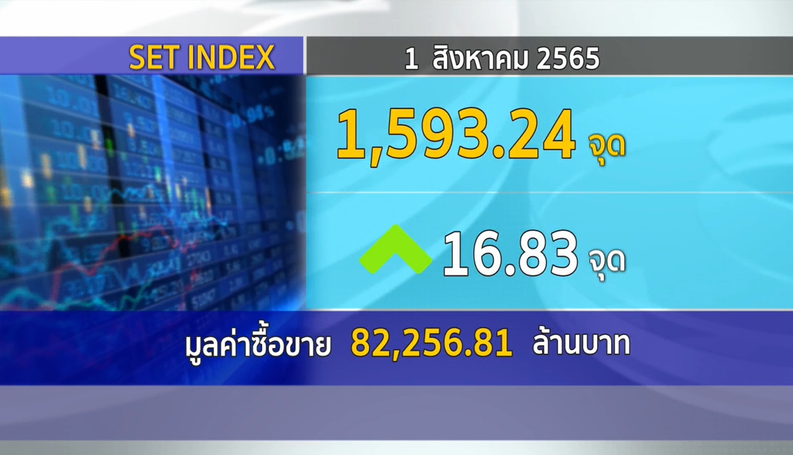 กทม. 1 ส.ค.-ตลาดหลักทรัพย์ ปิดวันนี้ที่ระดับ 1,593.24 จุด เพิ่มขึ้น 16.83 จุด (+1.07%) มูลค่าการซื้อขายราว 82,256.81 ล้านบาท