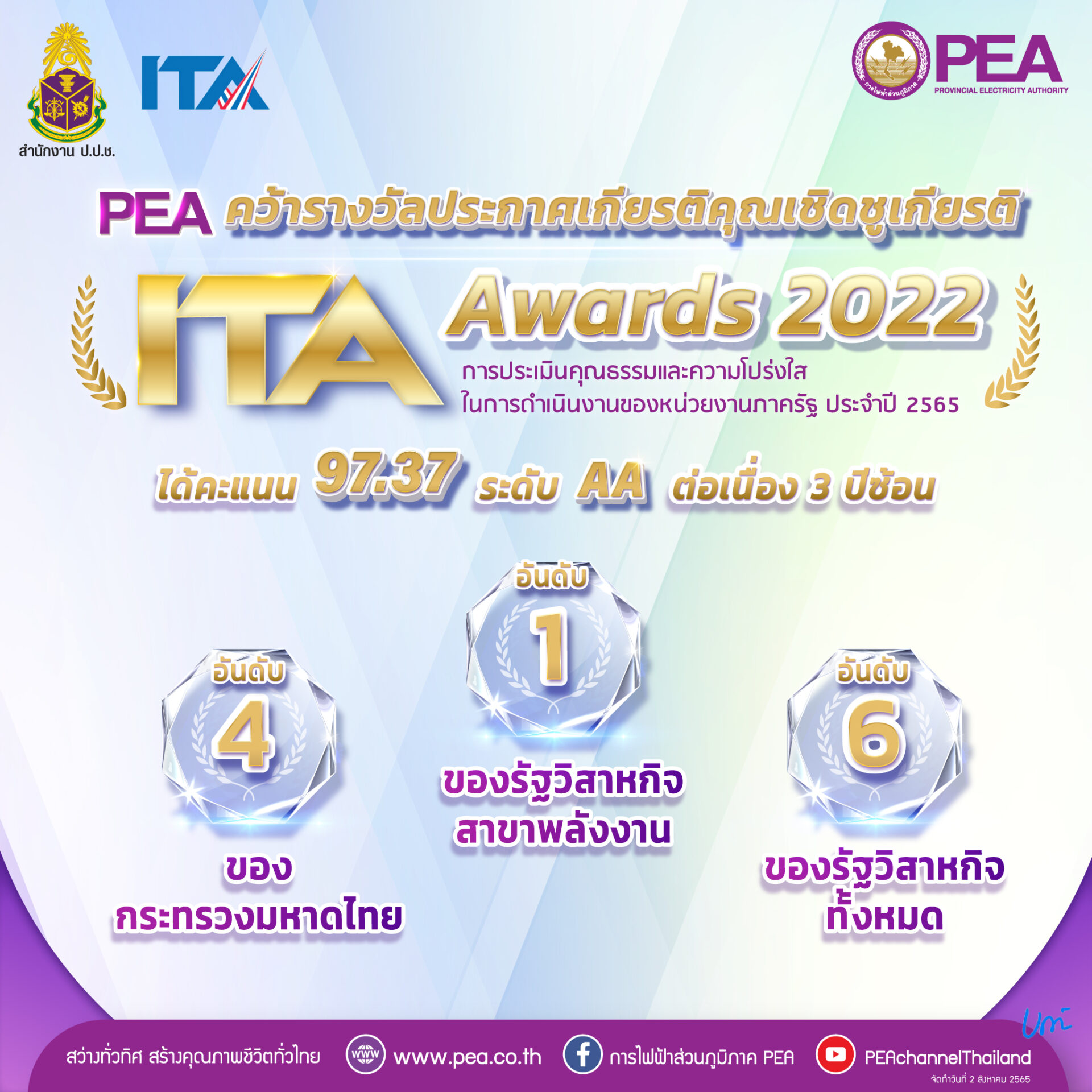 2 ส.ค.- การไฟฟ้าส่วนภูมิภาค (PEA) คว้ารางวัลประกาศเกียรติคุณเชิดชูเกียรติ ITA Awards 2022 ได้รับผลคะแนนการประเมินคุณธรรมและความโปร่งใสในการดำเนินงานของหน่วยงานภาครัฐ (ITA) 97.37 คะแนน ระดับ AA ต่อเนื่อง 3 ปีซ้อน โดย PEA ได้อันดับที่ 1 ของรัฐวิสาหกิจสาขาพลังงาน อันดับที่ 4 ของกระทรวงมหาดไทย และอันดับที่ 6 ของรัฐวิสาหกิจทั้งหมด ที่เข้ารับการประเมิน