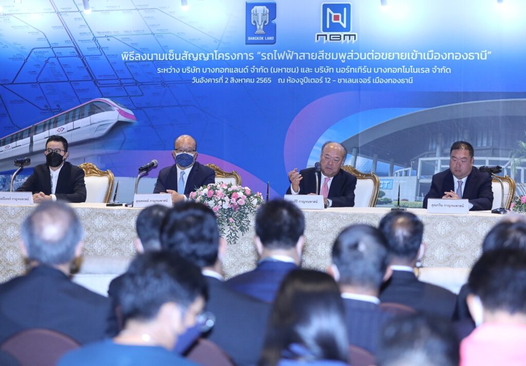 ผู้สื่อข่าวรายงานว่า ในวันนี้ (2 ส.ค.) บริษัท บางกอกแลนด์ จำกัด (มหาชน) (BLAND) จัดพิธีลงนามเซ็นสัญญากับบริษัท นอร์ทเทิร์น บางกอกโมโนเรล จำกัด (NBM) ซึ่งเป็นบริษัทย่อยของกลุ่มกิจการร่วมค้าบีเอสอาร์ (BSR JV consortium) ที่ร่วมทุนกันระหว่าง บริษัท บีทีเอส กรุ๊ป โฮลดิ้งส์ จำกัด (มหาชน) (BTSG), บริษัท ซิโน-ไทย เอ็นจีเนียริ่ง แอนด์ คอนสตรัคชั่น จำกัด (มหาชน) (STEC) และบริษัท ราช กรุ๊ป จำกัด (มหาชน) ใน “โครงการรถไฟฟ้าสายสีชมพู ส่วนต่อขยายเข้าเมืองทองธานี” ด้วยเม็ดเงินลงทุน 4,000 ล้านบาท สำหรับส่วนต่อขยาย 2 สถานี ได้แก่ สถานีอิมแพ็ค เมืองทองธานี (ชาเลนเจอร์ อาคาร 1) และสถานีทะเลสาบ เมืองทองธานี โดยการก่อสร้างส่วนต่อขยายนี้จะแล้วเสร็จและสามารถเปิดให้บริการได้ในปี 2567