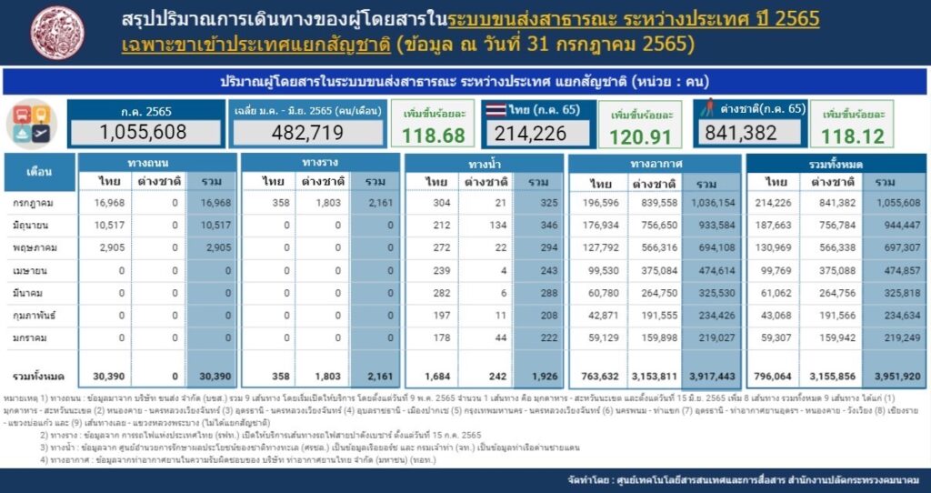 3. ทางราง มีปริมาณผู้โดยสาร ก.ค. 2565 รวม 4,609 คน เมื่อพิจารณาสัดส่วนการเดินทางขาเข้าและขาออกประเทศพบว่า มีปริมาณการเดินทางขาเข้า 2,161 คน คิดเป็น 47% และมีปริมาณการเดินทางขาออก 2,448 คน คิดเป็น 53% โดยขณะนี้ การเดินทางในระบบราง ได้มีการเปิดเดินรถไฟกับประเทศเพื่อนบ้านเพิ่มขึ้น เช่น รถไฟเชื่อมต่อกับสปป.ลาว เพื่อให้สามารถรองรับการเดินทางระหว่างประเทศได้เพิ่มมากขึ้น