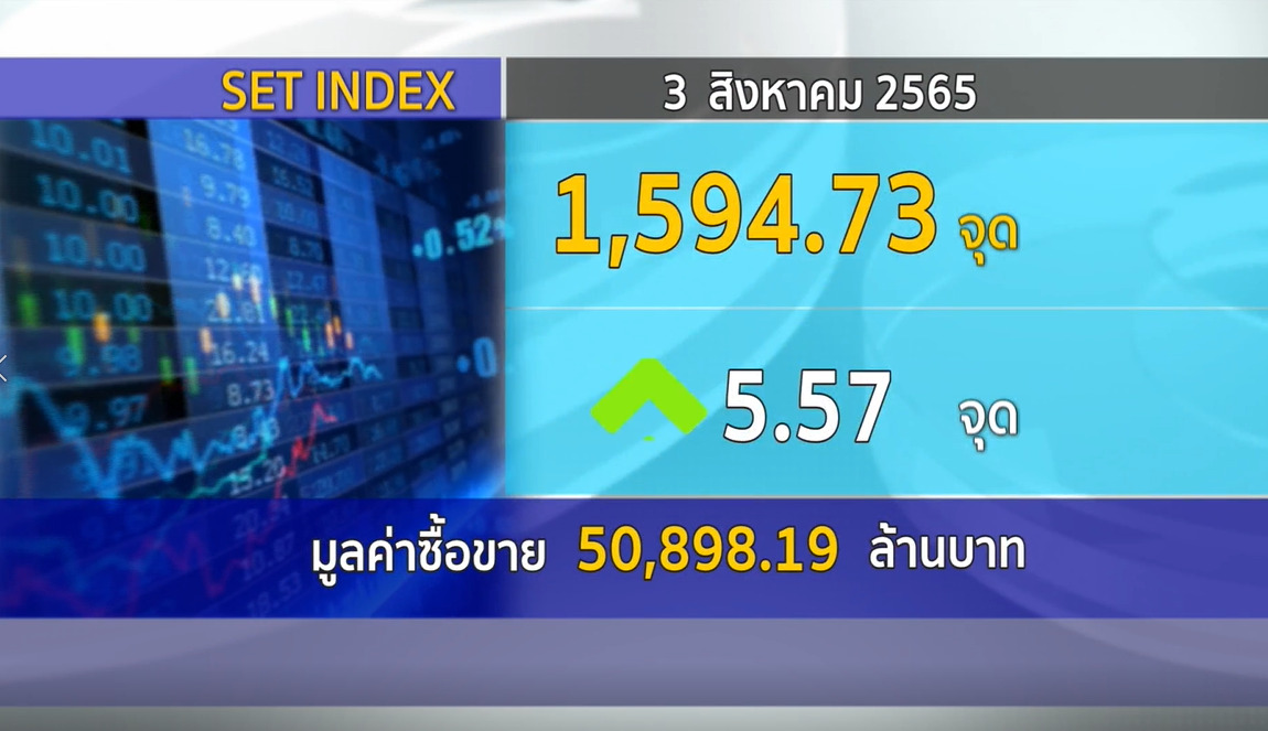 กทม. 3 ส.ค.-ตลาดหลักทรัพย์ ปิดวันนี้ที่ระดับ 1,594.73 จุด เพิ่มขึ้น 5.57 จุด (+0.35%) มูลค่าการซื้อขายราว 50,898.19 ล้านบาท