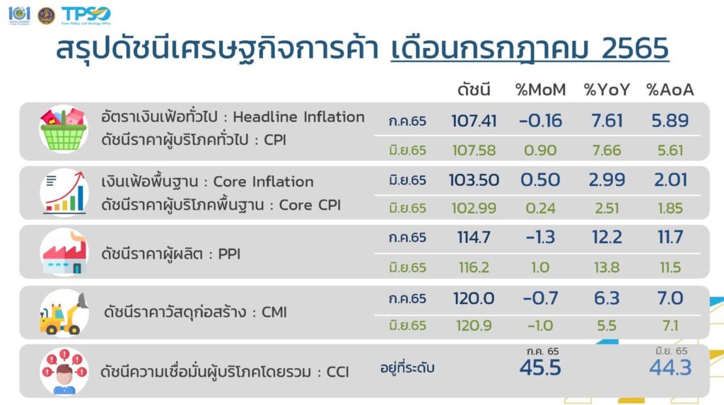 นายรณรงค์ พูลพิพัฒน์ ผู้อำนวยการสำนักงานนโยบายและยุทธศาสตร์การค้า(สนค.) กล่าวถึงดัชนีราคาผู้บริโภคทั่วไปเดือนกรกฎาคม 2565 หรือเงินเฟ้อเมื่อเทียบกับเดือนที่ผ่านมาลดลงครั้งแรกในรอบปี และเงินเฟ้อในเดือนนี้น้อยกว่าเดือนที่ผ่านมา โดยเมื่อเทียบกับเดือนที่ผ่านมาลดลงร้อยละ 0.16 เป็นการลดลงจากเดือนก่อนหน้าครั้งแรกในรอบปี 2565 และอัตราเงินเฟ้อทั่วไปน้อยกว่าเดือนที่ผ่านมาอยู่ที่ร้อยละ7.61 เมื่อเทียบกับเดือนเดียวกันปีก่อน สำหรับเงินเฟ้อพื้นฐาน เมื่อหักอาหารสดและพลังงานออกในเดือนนี้อยู่ที่ร้อยละ2.99 สินค้ากลุ่มพลังงานยังเป็นสาเหตุหลักต่ออัตราเงินเฟ้อเดือนกรกฎาคม 2565 ซึ่งเป็นต้นทุนในทุกขั้นตอนการผลิตและโลจิสติกส์ของสินค้าและบริการ ประกอบกับอุปสงค์ในประเทศปรับตัวดีขึ้น จากการท่องเที่ยว การส่งออกและราคาสินค้าเกษตรสำคัญสูงขึ้น ทำให้อัตราเงินเฟ้อในเดือนนี้เป็นผลของการคำนวณจากฐานดัชนีราคาผู้บริโภคของเดือนกรกฎาคม 2564 ที่ค่อนข้างต่ำ จึงทำให้เงินเฟ้อขยายตัว ขณะเดียวกันทำให้อัตราเงินเฟ้อเฉลี่ย 7 เดือนตั้งแต่มกราคม-กรกฎาคม 65 อยู่ที่ร้อยละ 5.89