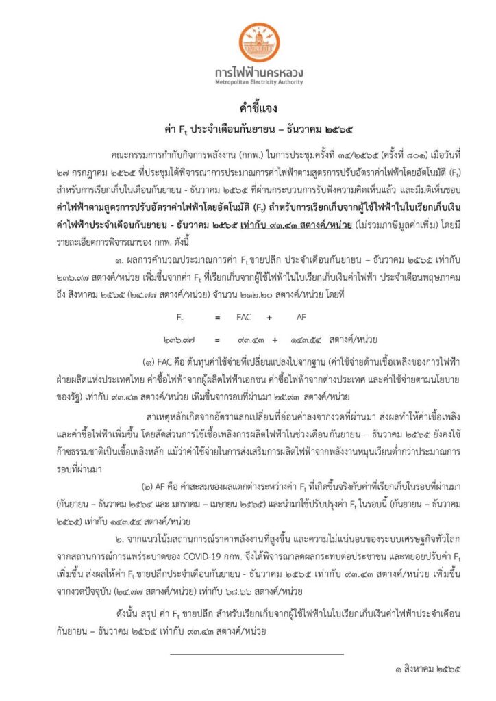 สำหรัยผลการคำนวณประมาณการค่า Ft ที่แท้จริง ประจำเดือนกันยายน – ธันวาคม 65คือ 236.97 สตางค์/หน่วยเพิ่มขึ้นจากค่า Ft ที่เรียกเก็บจากผู้ใช้ไฟฟ้าในใบเรียกเก็บเงินค่าไฟฟ้า ประจำเดือนพฤษภาคมถึงสิงหาคม (24.77 สตางค์/หน่วย) จำนวน 212.20 สตางค์/หน่วย โดยที่ Ft = FAC + AF. คือ 236.97=93.43+143.54 สตางค์/หน่วย
