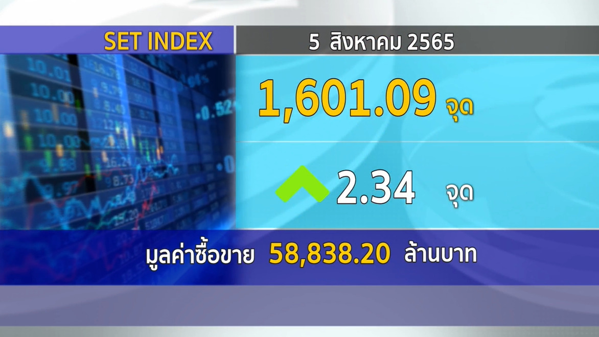 กทม. 5 ส.ค.-ตลาดหลักทรัพย์ ปิดวันนี้ที่ระดับ 1,601.09 จุด เพิ่มขึ้น 2.34 จุด (+0.15%) มูลค่าการซื้อขายราว 58,838.20 ล้านบาท