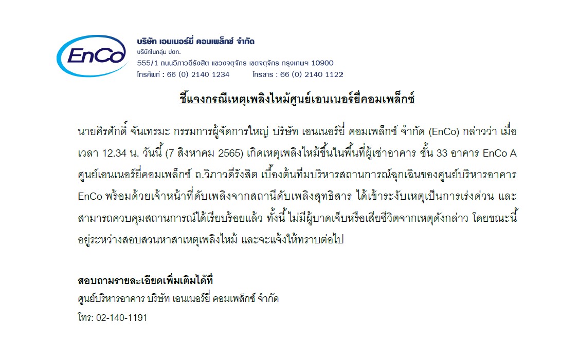 กรุงเทพฯ ส.ค.- นายศิรศักดิ์ จันเทรมะ กรรมการผู้จัดการใหญ่ บริษัท เอนเนอร์ยี่ คอมเพล็กซ์ จำกัด (EnCo) กล่าวว่า เมื่อเวลา 12.34 น. วันนี้ (7 สิงหาคม 2565) เกิดเหตุเพลิงไหม้ขึ้นในพื้นที่ผู้เช่าอาคาร ชั้น 33 อาคาร EnCo A ศูนย์เอนเนอร์ยี่คอมเพล็กซ์ ถ.วิภาวดีรังสิต เบื้องต้นทีมบริหารสถานการณ์ฉุกเฉินของศูนย์บริหารอาคาร EnCo พร้อมด้วยเจ้าหน้าที่ดับเพลิงจากสถานีดับเพลิงสุทธิสาร ได้เข้าระงับเหตุเป็นการเร่งด่วน และสามารถควบคุมสถานการณ์ได้เรียบร้อยแล้ว ทั้งนี้ ไม่มีผู้บาดเจ็บหรือเสียชีวิตจากเหตุดังกล่าว โดยขณะนี้อยู่ระหว่างสอบสวนหาสาเหตุเพลิงไหม้ และจะแจ้งให้ทราบต่อไป