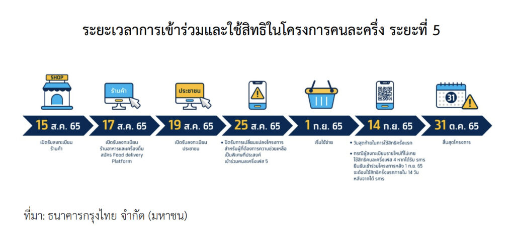 ทั้งนี้ ผู้ประกอบการร้านค้าที่มีคุณสมบัติเป็นไปตามเงื่อนไขที่โครงการกำหนดและสนใจเข้าร่วมโครงการฯ ระยะที่ 5 สามารถลงทะเบียนเข้าร่วมโครงการได้ตั้งแต่วันนี้เป็นต้นไป เวลา 06.00-22.00 น. ของทุกวัน ได้อย่างต่อเนื่องจนกว่ากระทรวงการคลังจะปิดรับสมัคร โดยผู้ประกอบการร้านค้าที่เคยเข้าร่วมโครงการฯ ระยะที่ 4 และมีแอปพลิเคชัน “ถุงเงิน” สามารถกดยืนยันสิทธิเข้าร่วมโครงการฯ ระยะที่ 5 ผ่านแอปพลิเคชัน “ถุงเงิน” ได้ทันที และสำหรับผู้ประกอบการร้านค้าที่เคยเข้าร่วมมาตรการ/โครงการอื่นของรัฐ หรือผู้ประกอบการรายใหม่ที่ไม่เคยเข้าร่วมมาตรการ/โครงการอื่นของรัฐ สามารถลงทะเบียนผ่าน www.คนละครึ่ง.com หรือติดต่อลงทะเบียนที่สาขา/จุดรับลงทะเบียนของธนาคารกรุงไทย จำกัด (มหาชน) ทั้งนี้ สามารถติดต่อกับเจ้าหน้าที่กรุงเทพมหานคร หรือเจ้าหน้าที่กระทรวงมหาดไทยในพื้นที่ เพื่อขอยืนยันการประกอบกิจการก่อนนำเอกสารไปยื่นที่สาขา/จุดรับลงทะเบียนของธนาคารกรุงไทย จำกัด (มหาชน) เพื่อดำเนินการเปิดแอปพลิเคชัน “ถุงเงิน” ต่อไป