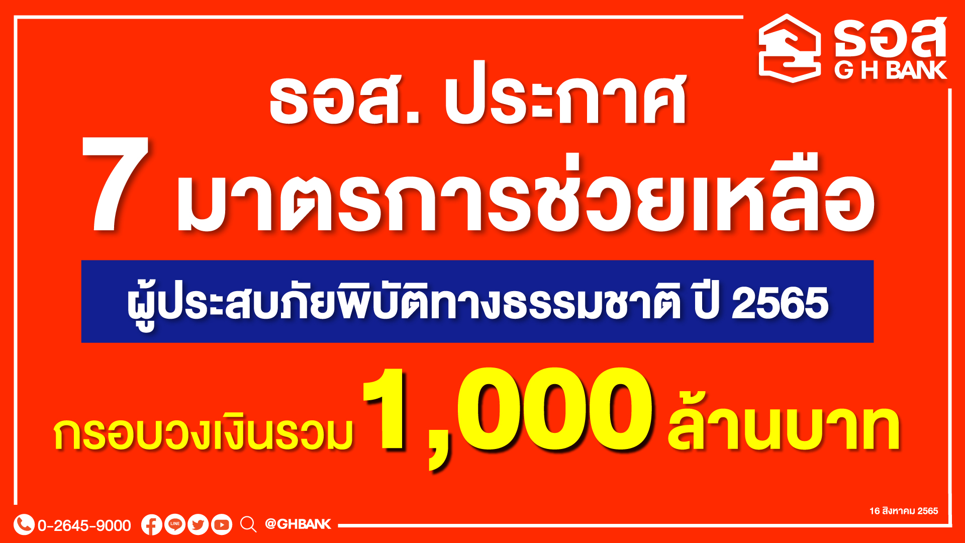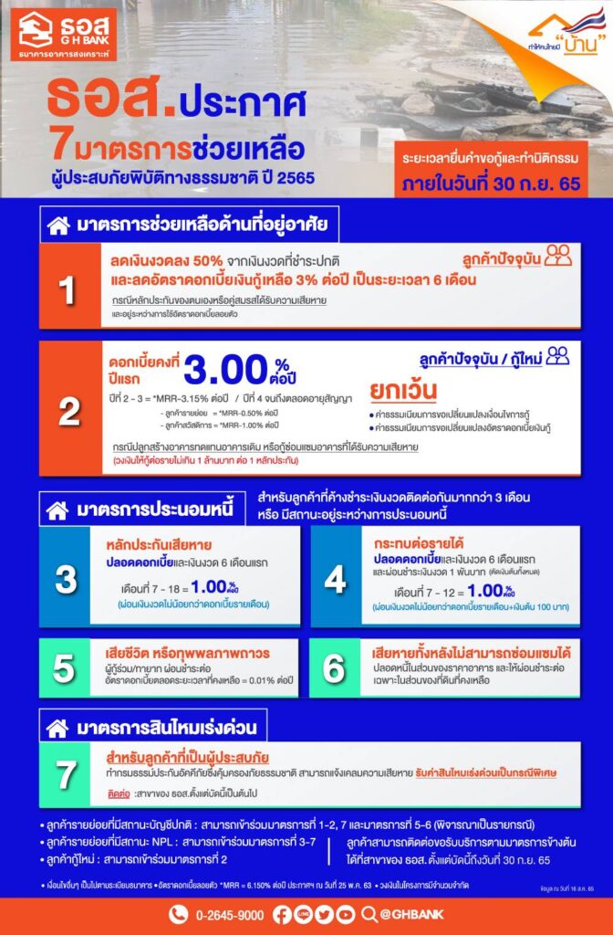 นายฉัตรชัย ศิริไล กรรมการผู้จัดการ ธนาคารอาคารสงเคราะห์ (ธอส.) เปิดเผยว่า หลังจากประเทศไทยต้องประสบกับ “พายุมู่หลาน” ที่ส่งผลให้มีฝนตกหนักถึงหนักมาก และเกิดน้ำท่วมฉับพลันในบางพื้นที่ของภาคเหนือ ภาคตะวันออกเฉียงเหนือ และภาคตะวันออก สร้างผลกระทบต่อที่อยู่อาศัย และการประกอบอาชีพของประชาชน ธอส. ในฐานะสถาบันการเงินเฉพาะกิจของรัฐมีที่มีพันธกิจ “ทำให้คนไทยมีบ้าน” จึงเร่งบรรเทาความเดือดร้อนให้แก่ลูกค้าประชาชน ตามนโยบายรัฐบาลของ พลเอก ประยุทธ์ จันทร์โอชา นายกรัฐมนตรี และรัฐมนตรีว่าการกระทรวงกลาโหม ด้วยการจัดทำ “มาตรการช่วยเหลือผู้ประสบภัยพิบัติ ทางธรรมชาติ ปี 2565” (กรอบวงเงินรวม 1,000 ล้านบาท) โดยพิจารณาตามระดับความเสียหาย ซึ่งมีรายละเอียด ดังนี้