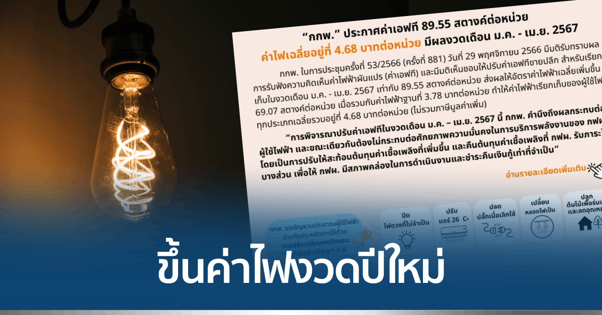 กรุงเทพฯ 29 พ.ย.- กกพ. ประกาศค่าเอฟทีงวดเดือน ม.ค. – เม.ย. 2567 อัตรา 89.55 สตางค์ต่อหน่วย ค่าไฟเฉลี่ยอยู่ที่ 4.68 บาทต่อหน่วย ขึ้นจากงวดนี้อีก 69.07 สตางค์ต่อหน่วย