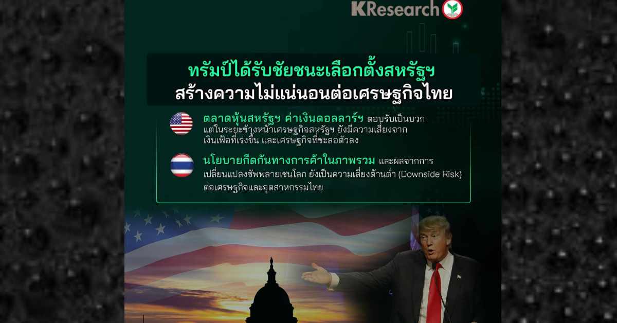 ศูนย์วิจัยกสิกรไทยวิเคราะห์ว่า หลังจากโดนัลด์ ทรัมป์ ได้รับชัยชนะเป็นประธานาธิบดีสหรัฐฯ สมัยที่ 2 และพรรครีพับลิกันสามารถครองเสียงส่วนใหญ่ทั้งในสภาบนและสภาล่าง (Republican Sweep) ส่งผลให้นโยบายต่างๆ ที่ทรัมป์เคยหาเสียงไว้มีแนวโน้มที่จะสามารถผลักดันให้ผ่านสภาฯ ได้ไม่ยากนัก ซึ่งหลังจากพิธีสาบานตนเข้ารับตำแหน่งในวันที่ 20 มกราคม 2568 นโยบายเร่งด่วนที่คาดว่าจะเห็นใน 100 วันแรก ได้แก่ มาตรการปรับเพิ่มภาษีศุลกากรขาเข้า มาตรการลดภาษีเงินได้นิติบุคคลและครัวเรือน รวมถึงการต่ออายุมาตรการลดภาษีที่ประกาศใช้ในปี 2560 มาตรการกีดกันแรงงานอพยพ และมาตรการสนับสนุนการผลิตพลังงานฟอสซิลในประเทศ เป็นต้น