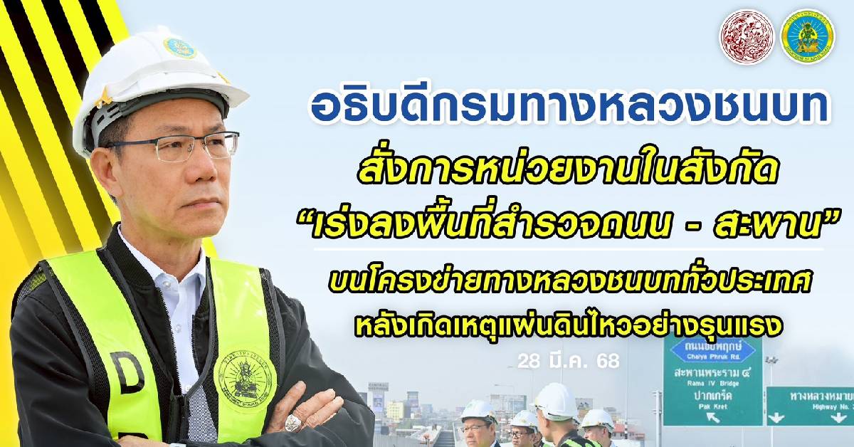 นายมนตรี เดชาสกุลสม อธิบดีกรมทางหลวงชนบท เปิดเผยว่า เมื่อช่วงบ่ายที่ผ่านมา ได้เกิดเหตุแผ่นดินไหวอย่างรุนแรงในประเทศเพื่อนบ้าน ส่งผลให้ในหลายพื้นที่ของประเทศไทยได้รับแรงสั่นสะเทือน จึงได้สั่งการอย่างเร่งด่วนไปยังสำนักงานทางหลวงชนบท และแขวงทางหลวงชนบททั่วประเทศ ให้ลงพื้นที่เร่งสำรวจถนน และสะพานบนโครงข่ายทางหลวงชนบทที่รับผิดชอบ โดยเฉพาะพื้นที่ที่อยู่ระหว่างการก่อสร้างในพื้นที่กรุงเทพฯ และปริมณฑล รวมทั้งในพื้นที่ทั่วประเทศ เพื่อสำรวจถึงผลกระทบ รวมถึงความเสียหายที่คาดว่าอาจจะได้รับจากเหตุการณ์แผ่นดินไหวในครั้งนี้