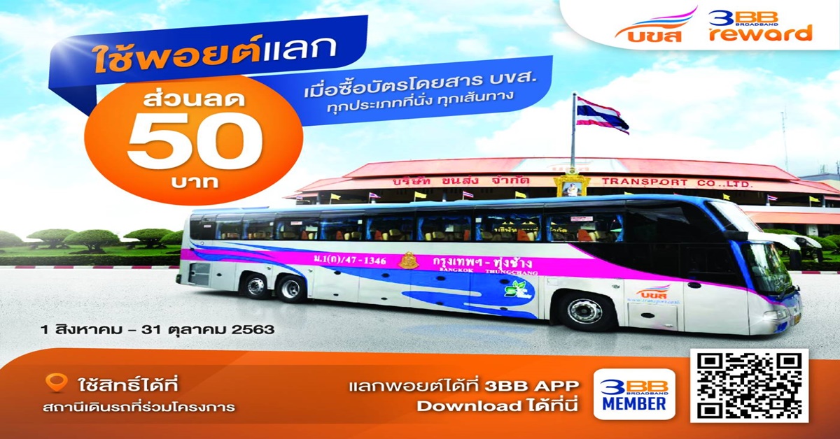 นายมาโนช สายชูโต รองกรรมการผู้จัดการใหญ่ฝ่ายธุรกิจเดินรถ รักษาการแทนกรรมการผู้จัดการใหญ่ บริษัท ขนส่ง จำกัด (บขส ) เปิดเผยว่า บขส.ได้ร่วมกับบริษัท ทริปเปิลที บรอดแบนด์ จำกัด (มหาชน) จัดโครงการลูกค้า 3BB Privilege เดินทางกับ บขส.รับส่วนลด 50 บาท ทุกที่นั่ง จำนวน 5,000 สิทธิ์ เริ่มตั้งแต่วันที่ 1 สิงหาคม – 31 ตุลาคม 2563