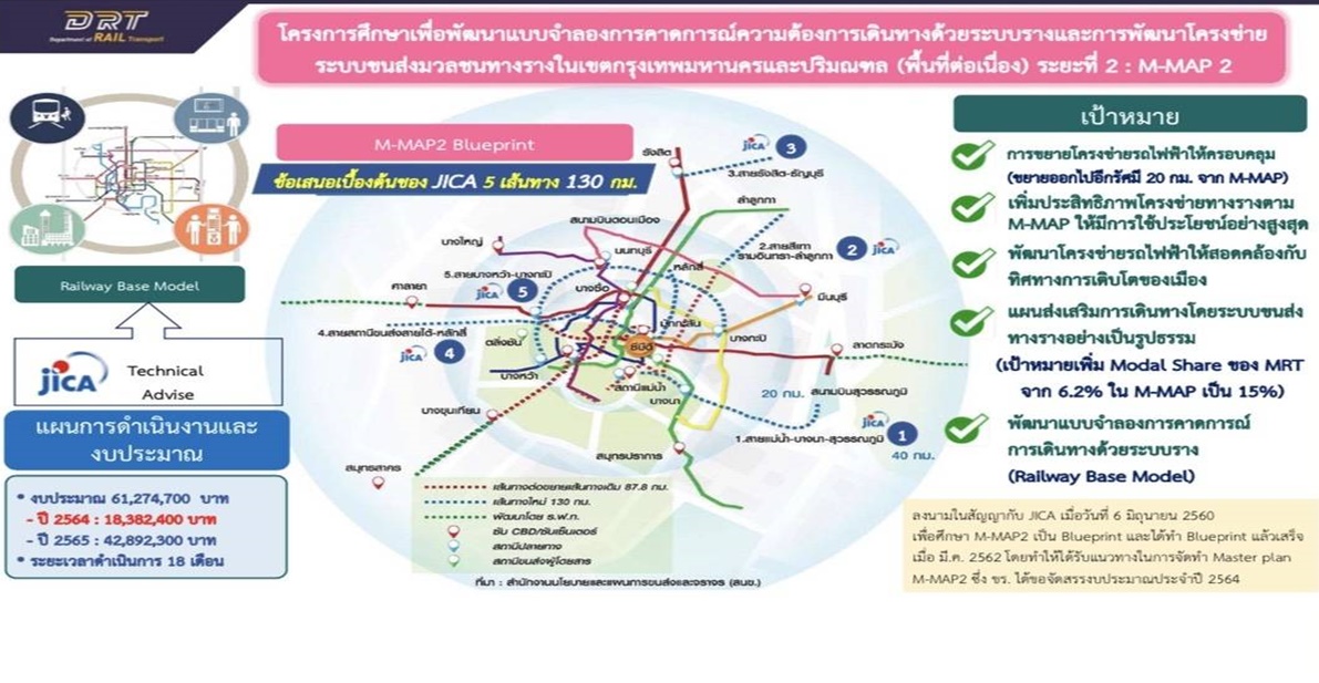 นายสรพงศ์ ไพฑูรย์พงษ์ อธิบดีกรมการขนส่งทางราง เปิดเผยว่า หลังจากกระทรวงคมนาคมกำกับหน่วยงานการรถไฟฟ้าขนส่งมวลชนแห่งประเทศไทย (รฟม.) และการรถไฟแห่งประเทศไทย (รฟท.) ได้ดำเนินการก่อสร้างรถไฟฟ้าทั่ว กรุงเทพมหานครและปริมณฑลรวมกว่า 14 สายทาง ระยะทางรวม 553.41 กม. มีสถานีให้บริการทั้งสิ้น 367 สถานี และจะทยอยเปิดให้บริการจนครบทุกสายถึงปี 2570 ดังนั้น ทางกรมการขนส่งทางรางจึงมีแนวคิดที่จะพิจารณาข้อมูลแผนการก่อสร้างรถไฟฟ้าระยะที่ 2 ตามผลศึกษาขององค์การความร่วมมือระหว่างประเทศแห่งญี่ปุ่น (ไจก้า) หรือแนวคิด M-Map 2 ที่เคยศึกษาไว้ว่าจะต้องมีการก่อสร้างขนส่งสาธารณะระบบราง โดยเฉพาะรถไฟฟ้าในระยะที่ 2 อีก 5 สายทาง ระยะทางรวม 130 กม.ซึ่งตามผลการศึกษามีแผนที่จะเริ่มดำเนินการปี 2564- 2565 เสร็จระหว่างปี 2572-2573 ประกอบด้วย 1.สายแม่น้ำทางรถไฟสายเก่า-บางนา-สนามบินสุวรรณภูมิ 2.สายสีเทา วัชรพล-รามอินทรา -ลำลูกกา 3 .ส่วนต่อขยายสีแดง รังสิต-ธัญบุรี 4 .สายใหม่ สถานีขนส่งสายใต้-หลักสี่ และ 5. สายใหม่ บางหว้า-บางกะปิ