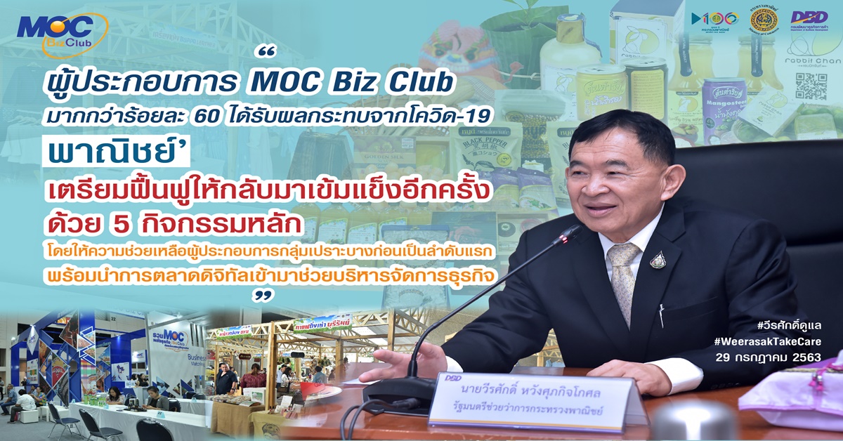 นายวีรศักดิ์ หวังศุภกิจโกศล รัฐมนตรีช่วยว่าการกระทรวงพาณิชย์ เปิดเผยว่า ในช่วงการระบาดของโควิด-19 พบว่าผู้ประกอบการกลุ่ม MOC Biz Club ได้รับผลกระทบมากกว่าร้อยละ 60 โดยเฉพาะผู้ประกอบการที่ขายสินค้าผ่านหน้าร้านเพียงอย่างเดียวและเป็นสินค้าที่ไม่มีความจำเป็นต่อชีวิตประจำวัน ส่งผลถึงผลประกอบการในภาพรวม จึงได้สั่งการให้กรมพัฒนาธุรกิจการค้าเร่งจัดทำแผนฟื้นฟูผู้ประกอบการกลุ่มนี้ให้กลับมาแข็งแกร่งอีกครั้ง เน้นสร้างความเข้มแข็งจากภายใน เติมเต็มทุกองค์ประกอบสำคัญในการประกอบธุรกิจ รวมทั้งขยายช่องทางการตลาดเพิ่มเติมให้มีความหลากหลาย
