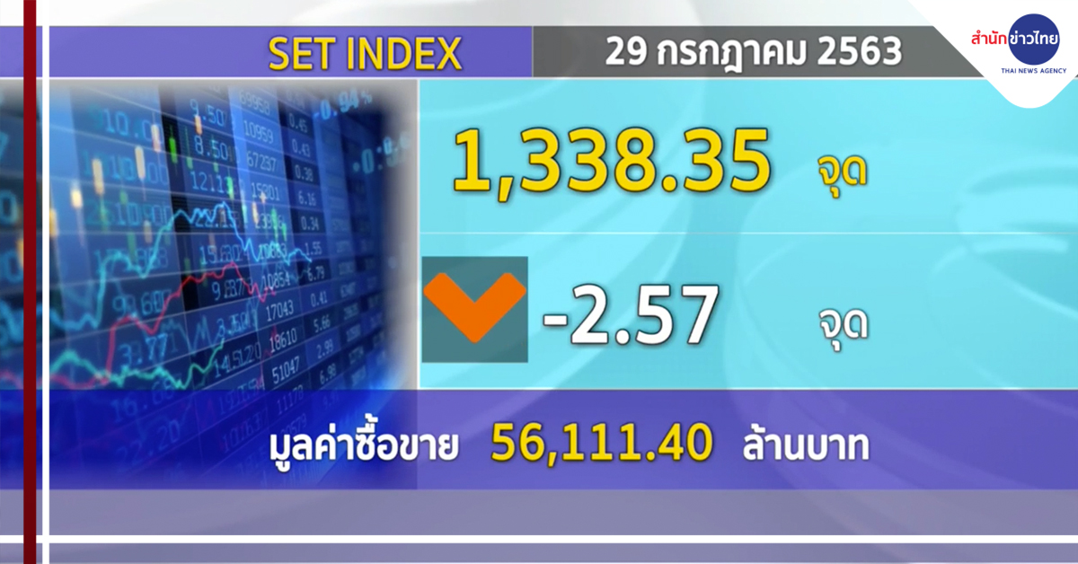 ดัชนีตลาดหลักทรัพย์ฯ ปิดวันนี้ (29 ก.ค.) ที่ระดับ 1,338.35 จุด ลดลง 2.57 จุด หรือ 0.19% มูลค่าการซื้อขาย 56,111.40 ล้านบาท โดยดัชนีเคลื่อนไหวทั้งแดนบวก-ลบ ทำระดับสูงสุด 1,349.91 จุด และทำระดับต่ำสุด 1,337.03 จุด
