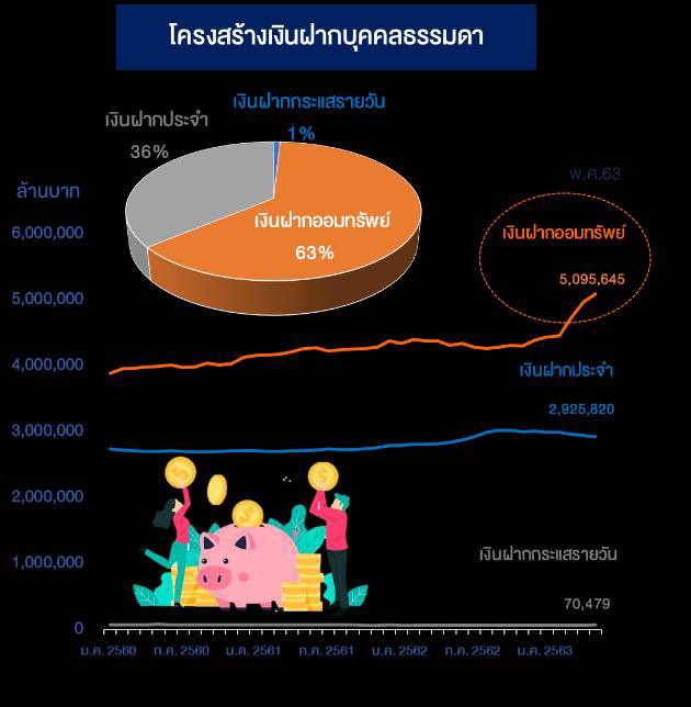 แม้ว่าในปัจจุบันการออมเงินมีให้เลือกหลายรูปแบบ แต่ก็ปฏิเสธไม่ได้ว่าการฝากเงินกับธนาคารพาณิชย์ยังคงมีบทบาทสูง โดยเฉพาะในช่วงที่เศรษฐกิจมีความเสี่ยง ดังเช่นในช่วงการแพร่ระบาดของโควิด-19 ที่กดดันเศรษฐกิจทั่วโลกให้เข้าสู่ภาวะถดถอยจนถึงขณะนี้ เงินฝากมีทิศทางเพิ่มขึ้นต่อเนื่องในอัตราเร่ง โดยเฉพาะเงินฝากบุคคลธรรมดาเพิ่มจาก 7.5 ล้านล้านบาท ณ สิ้นปี 2562 เป็น 8.1 ล้านล้านบาท ณ พฤษภาคม 2563 หรือเพิ่มขึ้นถึง 8.5% เมื่อเทียบกับช่วงปี 2560-2562 ที่เพิ่มขึ้นเฉลี่ย 4 % ต่อปี ซึ่งสวนทางกับอัตราดอกเบี้ยเงินฝากที่ปรับลดลง ทั้งนี้ เงินฝากออมทรัพย์เพิ่มขึ้นในอัตราเร่ง 16% จากสิ้นปี 2562 ทำให้สัดส่วนเงินฝากออมทรัพย์ขยับขึ้นจาก 59% เป็น 63% (อัตราดอกเบี้ยเฉลี่ย ณ มิถุนายน 0.25%) ขณะที่เงินฝากประจำมีสัดส่วนลดลงเหลือ 36% (อัตราดอกเบี้ยเฉลี่ย ณ มิถุนายน 0.44%)